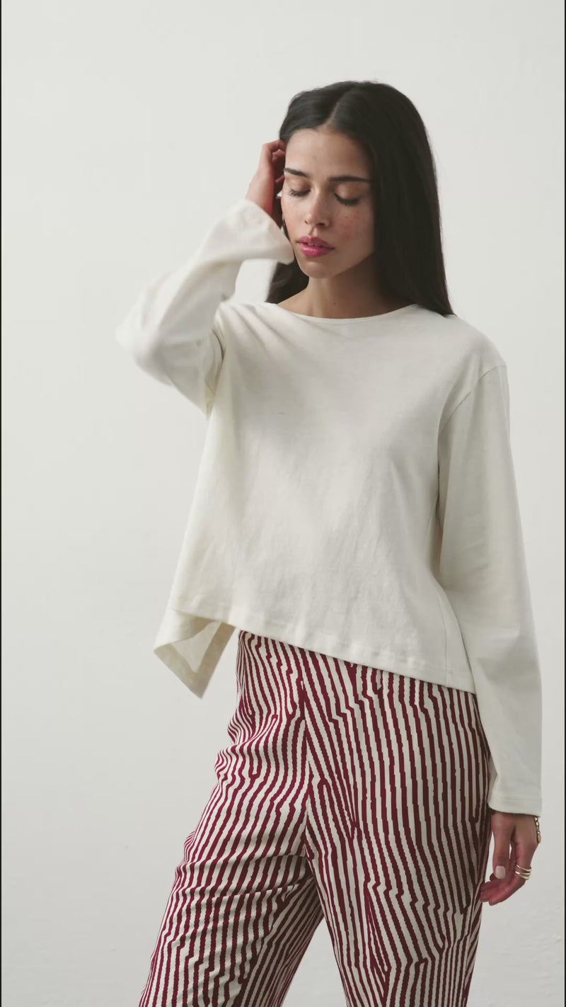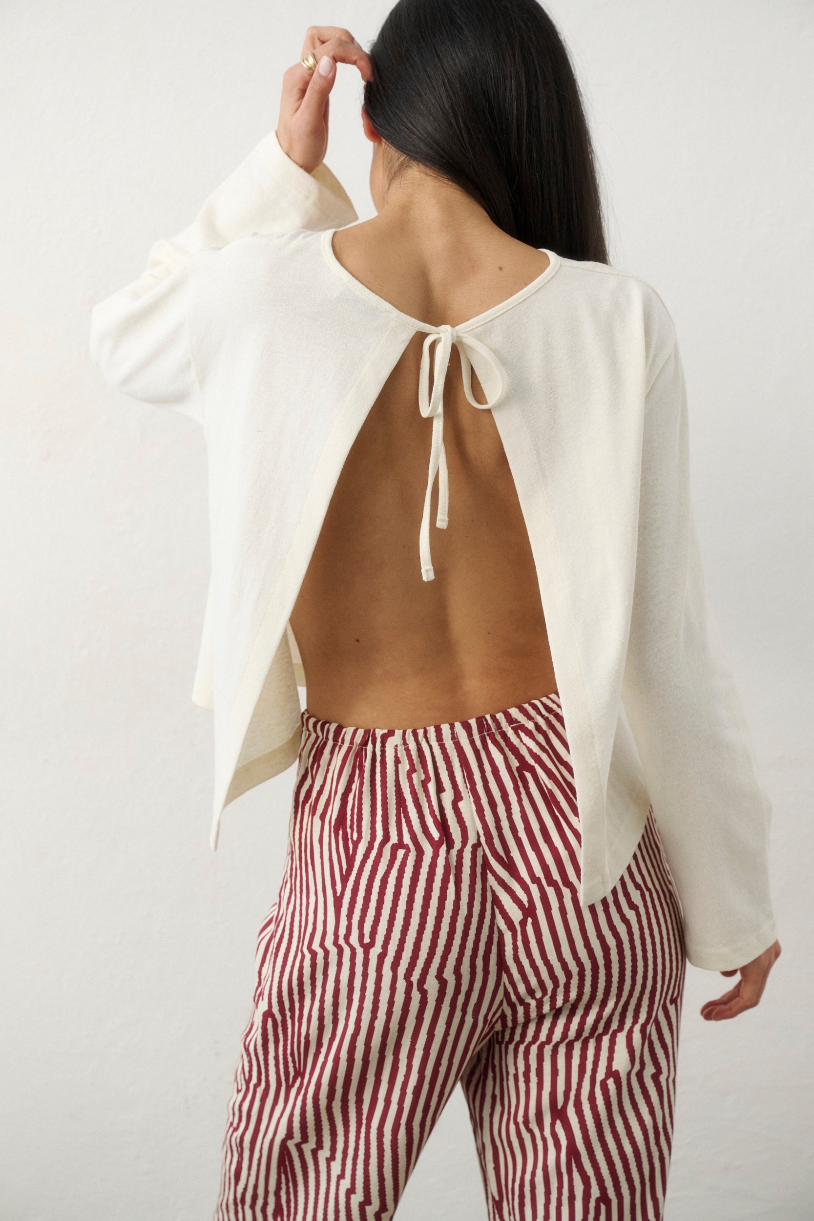 Minimalism in its purest form. The Skat Longsleeve proves that wardrobe basics can be just as exciting as evening pieces. Made from a lightweight, smooth knit crafted from a blend of organic cotton and hemp, it fits the silhouette like a second skin while offering natural breathability and all-day comfort. The most striking detail is at the back. A deep open-back cut is finished with a subtle tie made of fine straps, which not only stabilizes the shoulders but also adds a distinctly feminine and sensual character to the design. The soft ecru shade makes the Skat Longsleeve a perfect layering base, while also looking effortlessly striking worn on its own with your favorite Polly jeans.