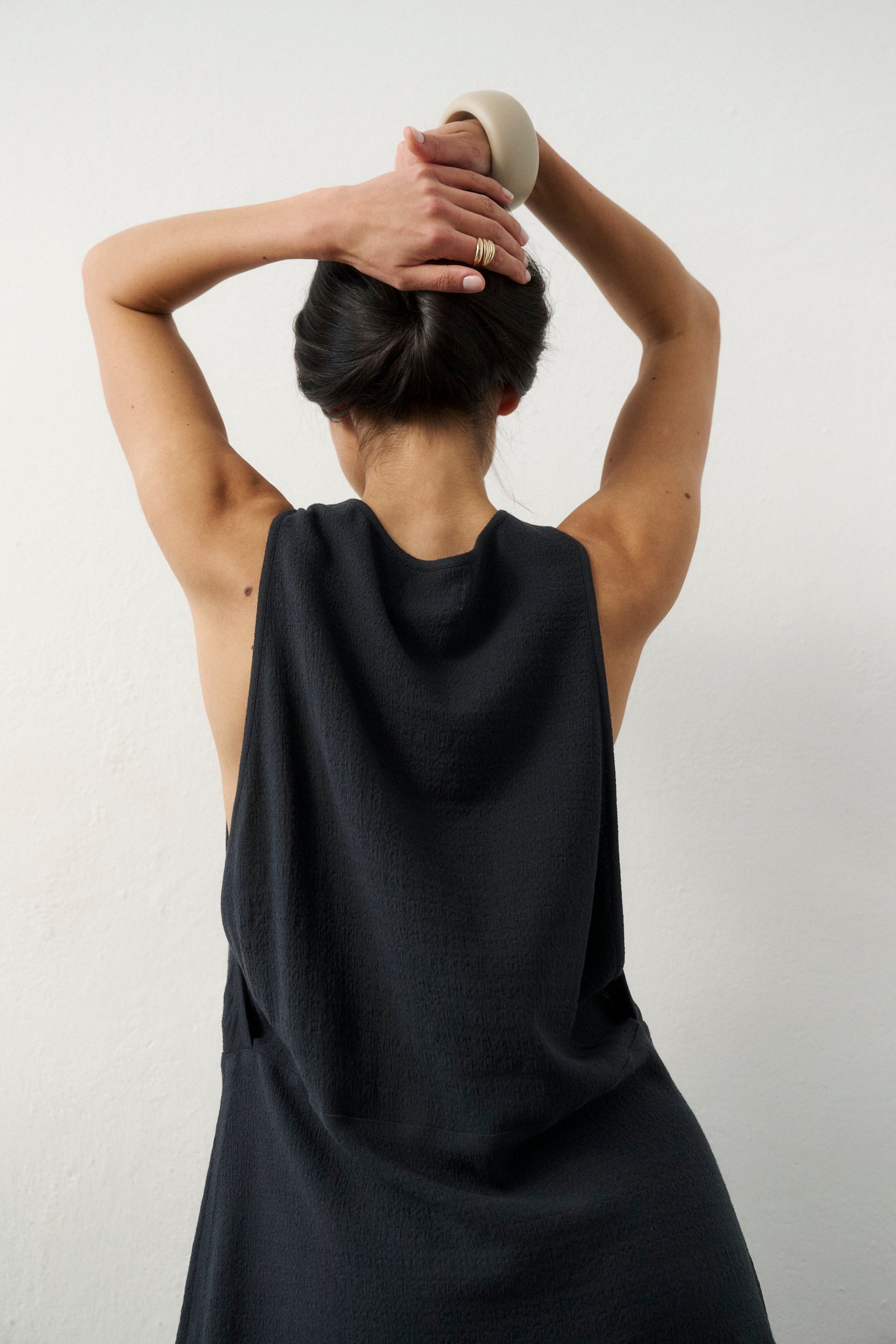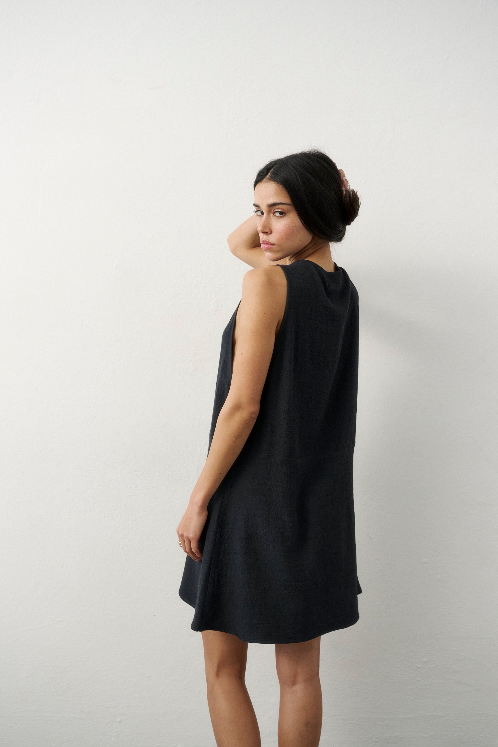 Discover the essence of effortless summer ease in a new interpretation. The Almond dress in a deep graphite shade is a design that celebrates freedom without compromising its modern edge. Its short, trapeze silhouette is contrasted by deep armhole cutouts that add lightness and a touch of nonchalance to the figure. It’s the perfect choice for women who appreciate minimalist design with an intriguing detail. The Almond Dress is an easy styling base – pair it with our leather mules to create a look that naturally balances elegance with an urban rhythm.