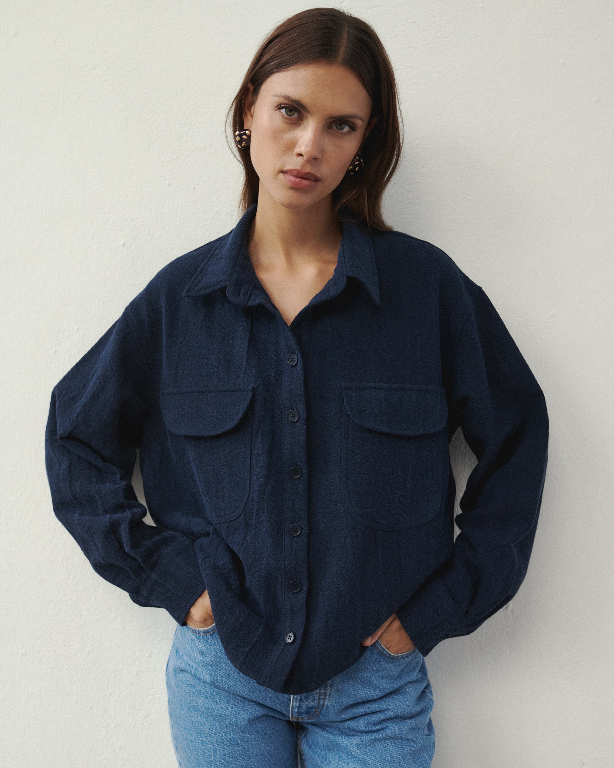 The slightly oversized STREAM shirt is an example of a shirt you must find a place for in your autumn wardrobe. It's perfect for everyday wear: to work, for meetings with friends, or for weekend trips. Its classic cut with a collar, button closure, and two practical pockets has been broken by a unique, 100% cotton material with a delicate irregular herringbone texture. The fabric has been subjected to a special hand-washing process using stones, which is why each piece may have a slightly different look and different shades on its surface. You can wear it on its own or unbuttoned over a t-shirt or bodysuit. It will pair great with SILVERSTONE or SEVENTEEN jeans, as well as with the NILA skirt. The whole look will be completed with one of the SAKI bandanas from the current collection and the DINA jacket thrown over it.