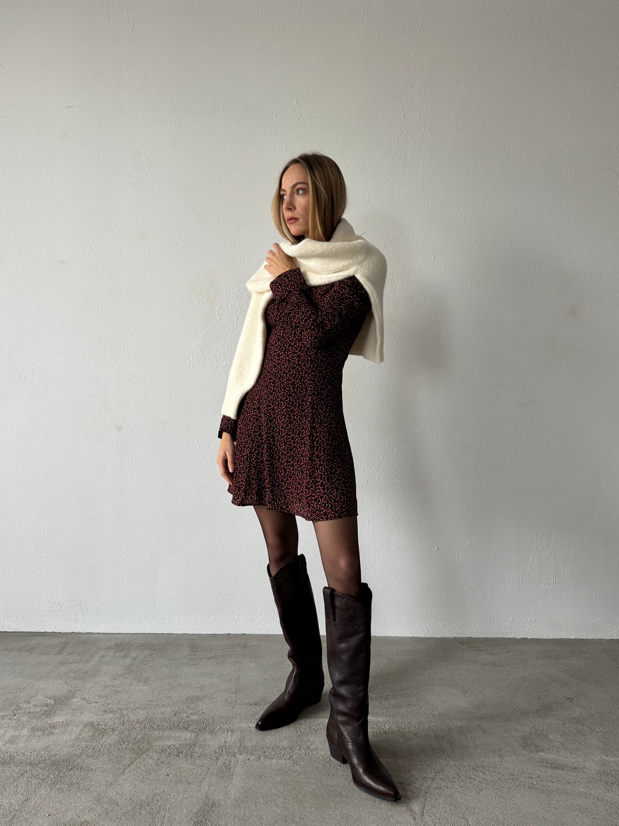 The short MATHILDE dress is an example of effortless, casual elegance. It has a comfortable length, a cut that emphasizes the waist, a deep V-neck, and long, uniquely designed sleeves with puff details and pleats along the length. It's completed with a flowing viscose fabric in a small floral pattern, which ensures comfort, ease, and breathability all day long. It's the perfect style for work and other everyday occasions. By choosing the right accessories, it can also work for more formal events.