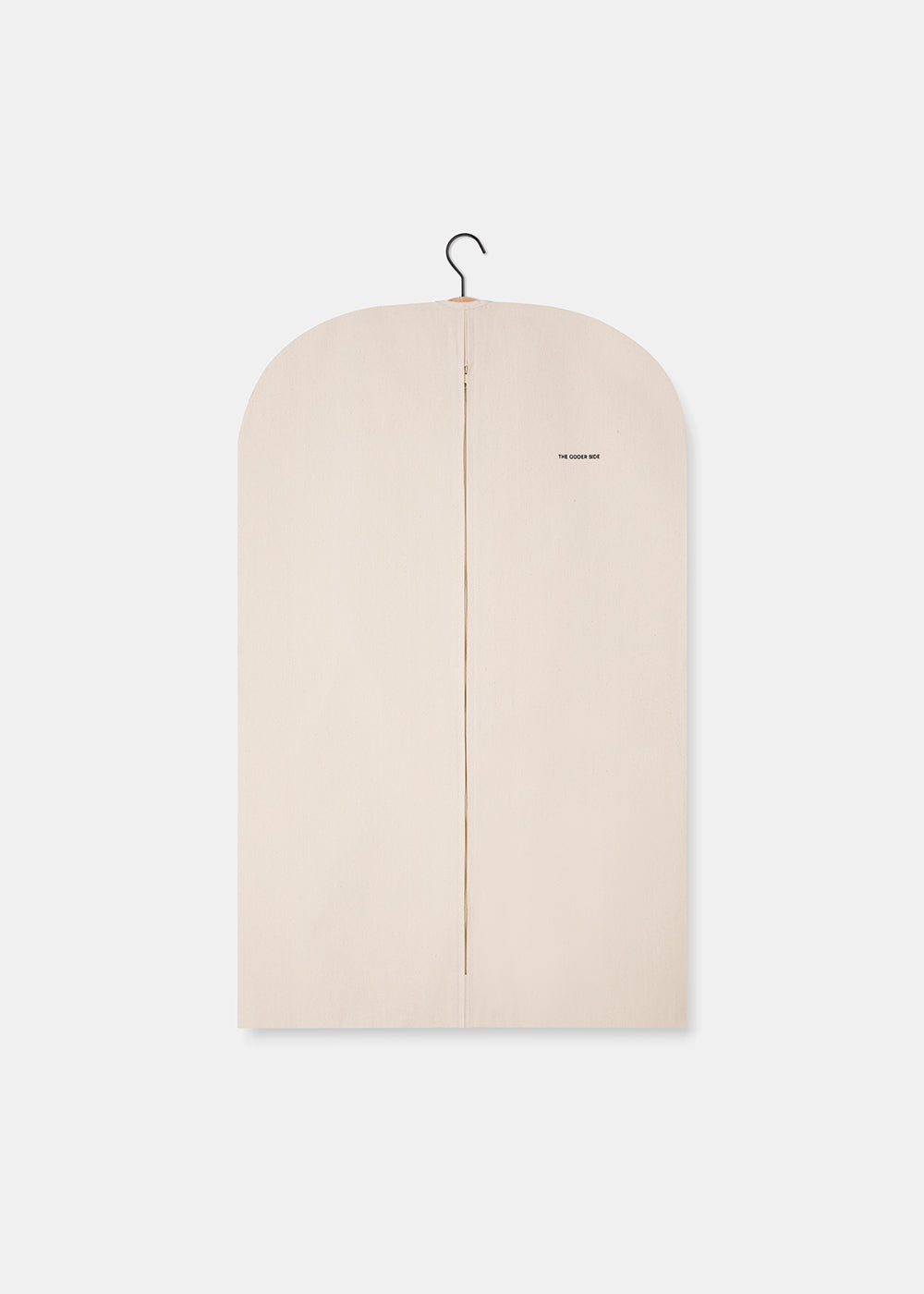 A short garment bag with The Odder Side logo is a practical and simple way to keep your clothes in perfect condition. It will protect your favourite items from harmful factors and keep your wardrobe tidy. The cover is ideal for travelling, ensuring the safe transport of shirts, short dresses and jackets. Made of 260 g/m² cotton canvas. It has a zip fastening along its entire length. Dimensions: 105 x 64 cm. The set includes a wooden hanger with the logo.