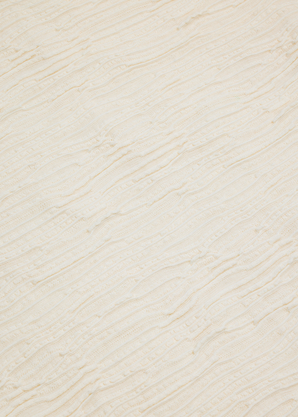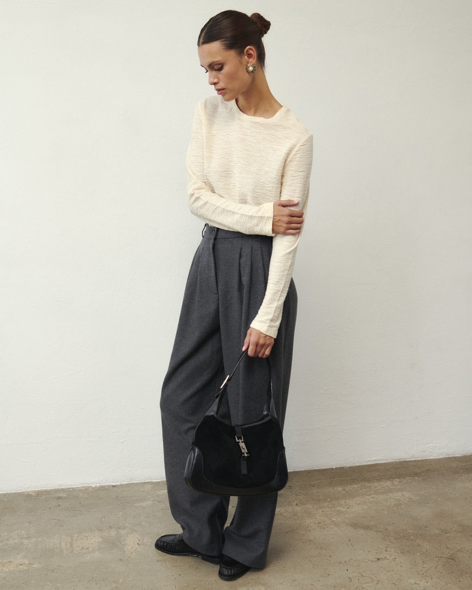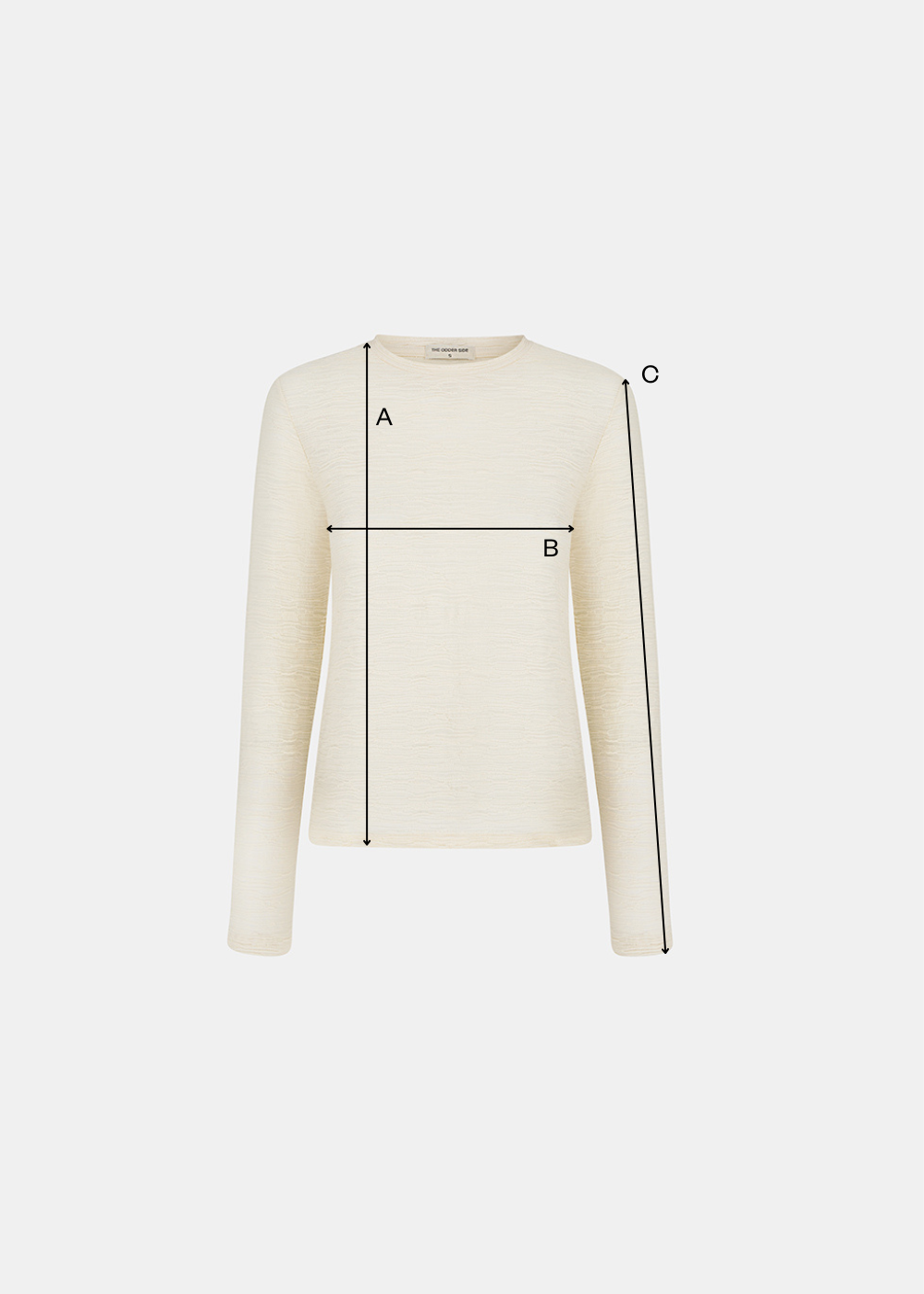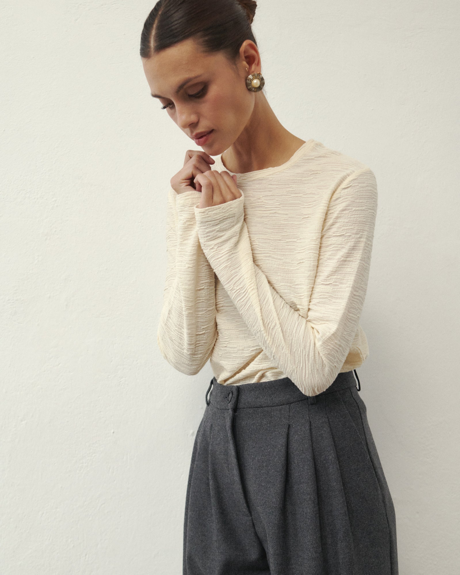 MASSA is a subtle ecru-coloured long-sleeved top. It has a classic style, a relaxed fit and a semi-circular neckline. You will love its delicate fabric with a textured surface, which is a combination of cotton and elastane. It is perfect on its own with GABLE trousers or for cooler days under a jumper or sweatshirt.
