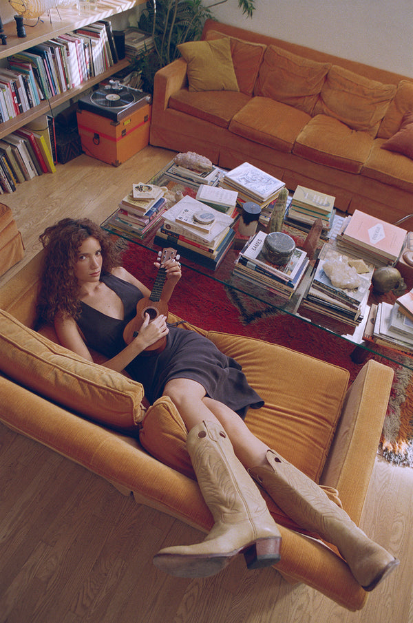 All these pieces — the arrangement of unfinished notes on the table, the vintage cowboy boots from Palm Springs she might take for a walk today — fit together to make her, her.