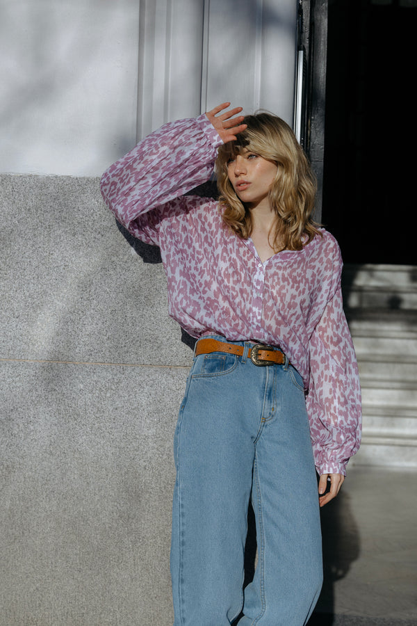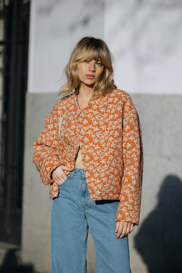 une chemise en jean Jensen oversize dans une teinte claire et une veste Rae réversible avec un jacquard floral dessiné par un studio français : un côté est écru, l'autre dans notre chère teinte ocre.