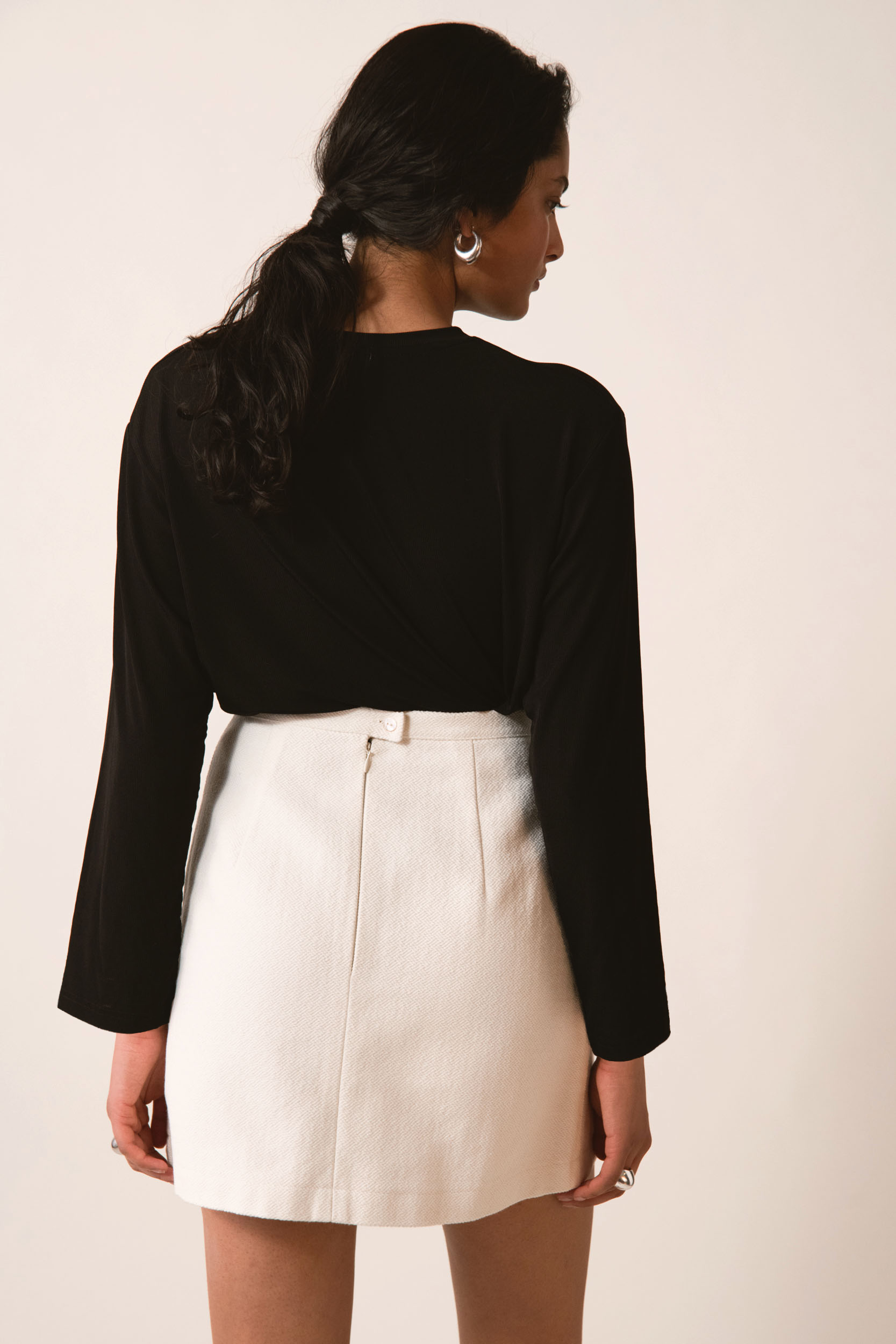 La jupe Stellar est une mini courte à la forme singulière. Confectionnée en coton dense au tissage marqué, elle attire le regard grâce à une profonde découpe à l’avant qui lui confère une ligne asymétrique et irrégulière. Sa coupe simple associée à la teinte naturelle écru en fait une base qui définit toute la silhouette. La jupe est dotée d’une fermeture discrète par zip invisible et bouton. Associez-la au DAKOTA WOOLEN SWEATER GRAPHITE pour contraster sa structure avec la douceur d’une maille.
