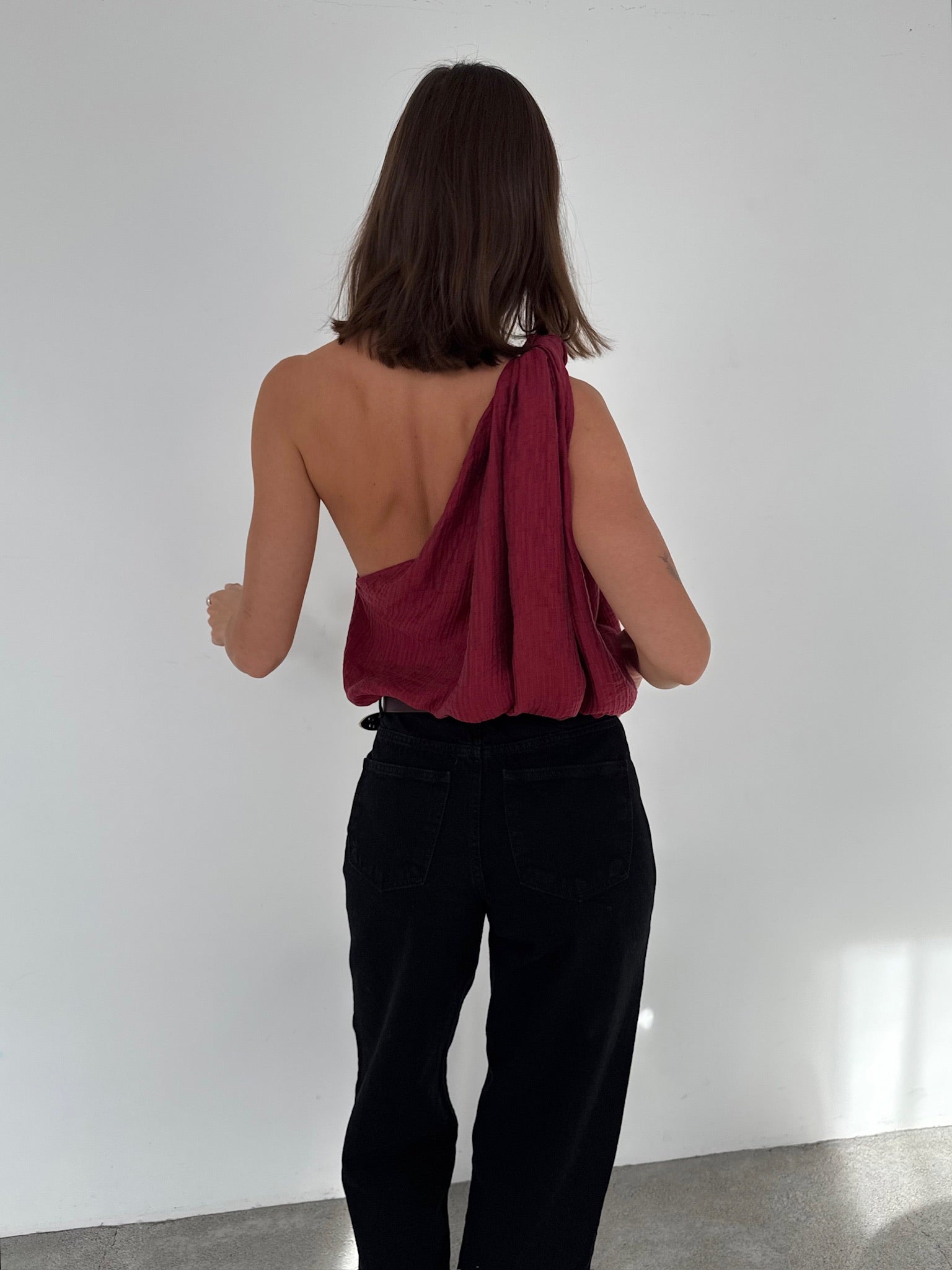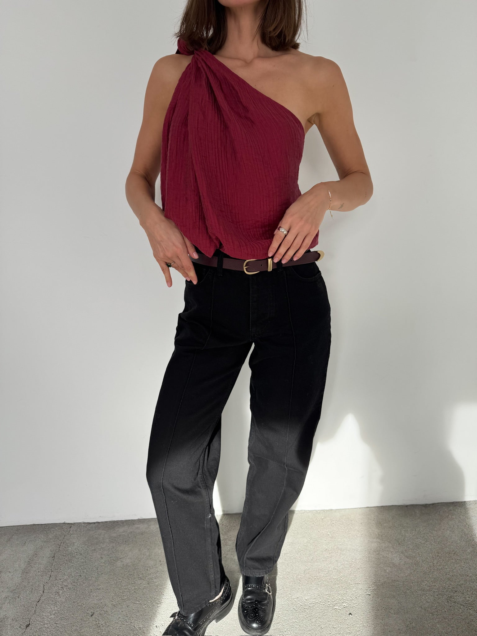 Le top NEGRONI, best-seller de la collection, se décline ici en couleur bordeaux et séduit par son design simple mais ingénieux. Son nœud sur l’épaule droite crée un joli drapé à l’avant et à l’arrière du vêtement. Confectionné dans un mélange respirant de viscose et de lyocell avec une touche de polyamide, il offre confort et légèreté. Sa coupe asymétrique et fluide s’adapte à toutes les silhouettes et met en valeur les épaules ainsi que le décolleté. Parfait pour une soirée en club ou entre amis– porte-le avec le jean SILVERSTONE ou le pantalon BOHEME et quelques bijoux élégants pour un look raffiné et tendance.