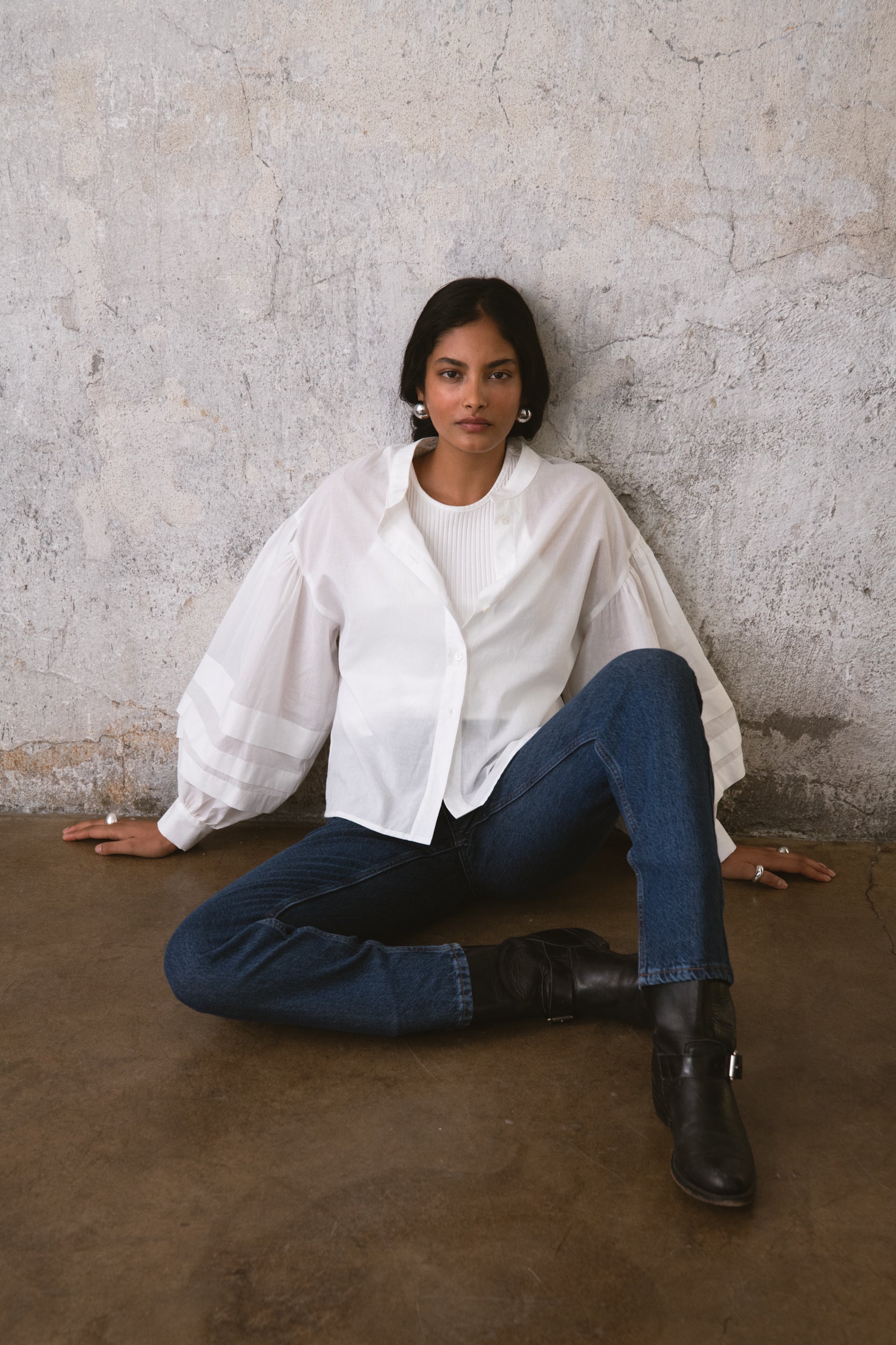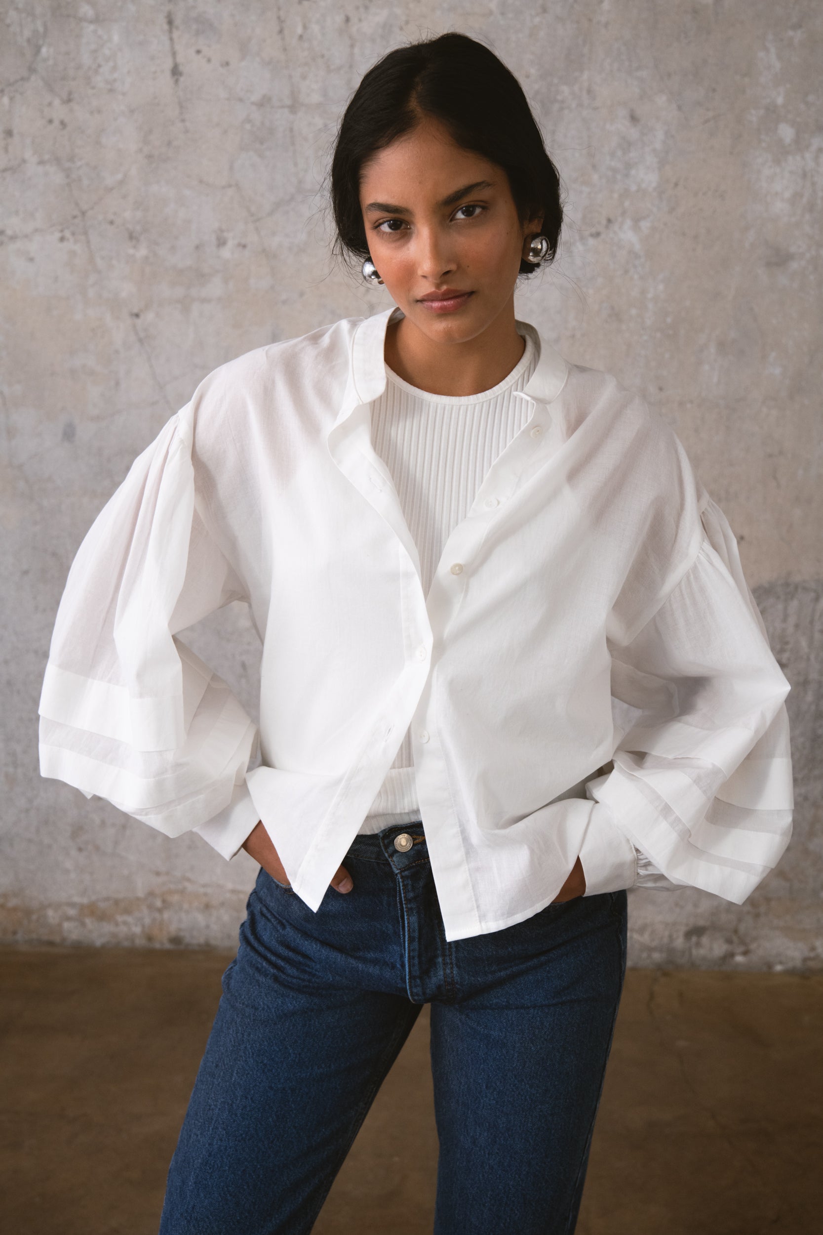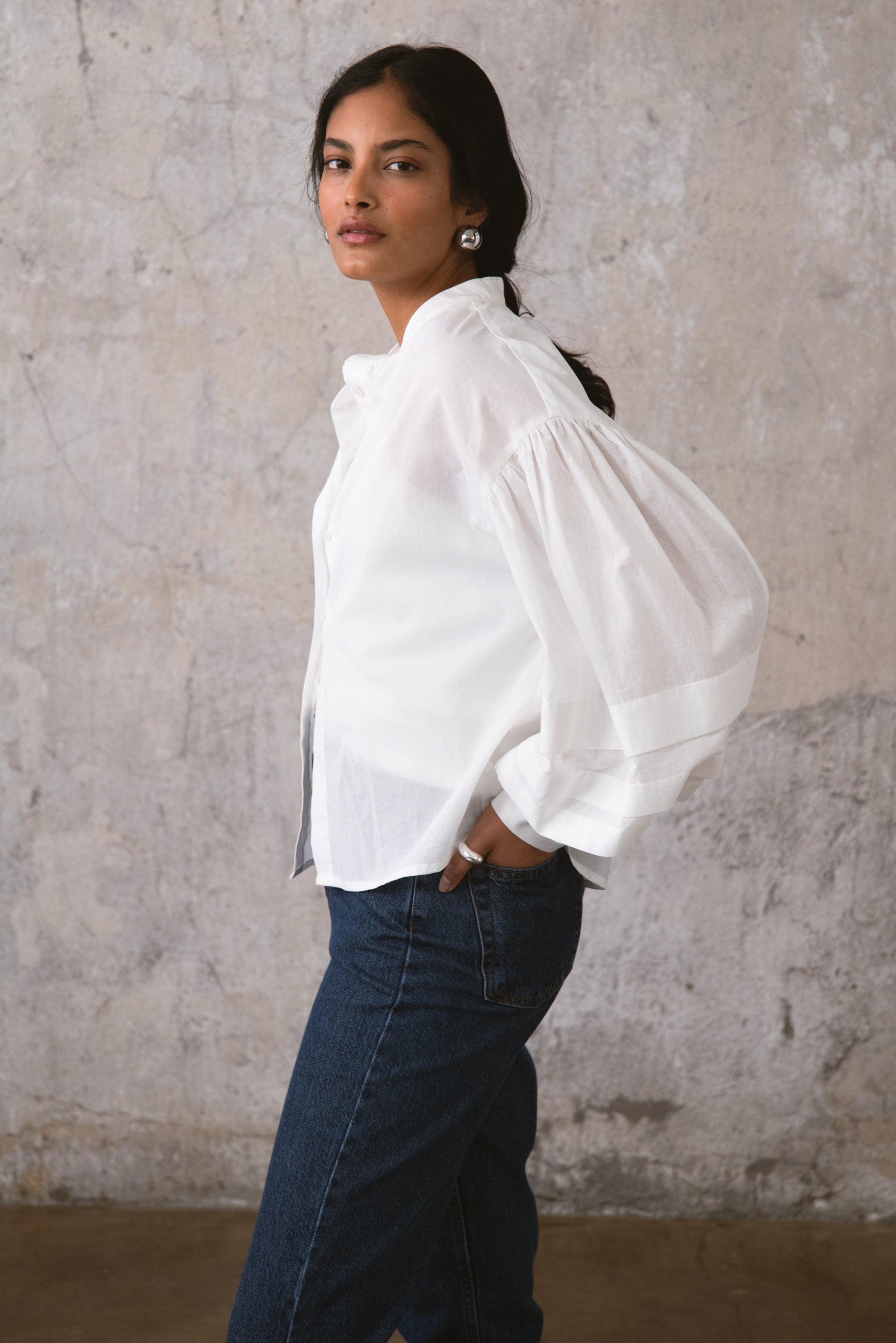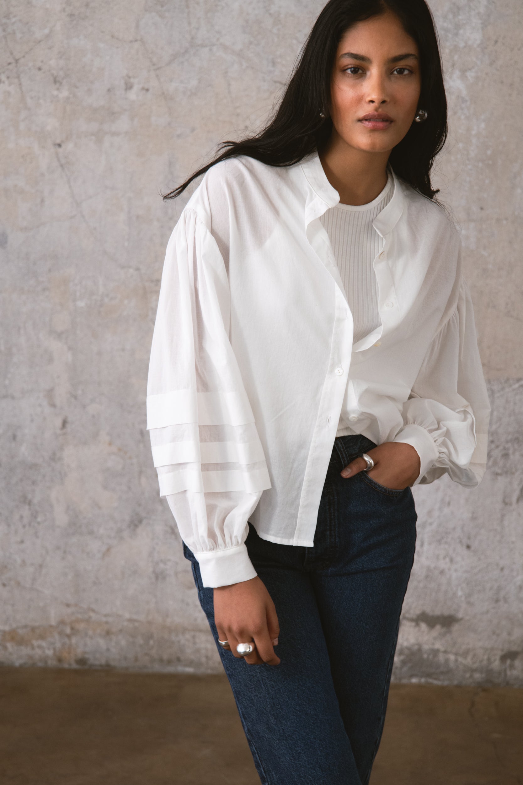 TANGO SHIRT to klasyczna koszula w swobodnej odsłonie. Uszyta z 100% bawełny o naturalnej strukturze, zapewnia swobodę przez cały dzień. Subtelna stójka oraz charakterystyczne rękawy nadają jej formę, a delikatne marszczenia na ramionach dodają lekkości stylizacji. Detale w postaci guzików z masy perłowej domykają ten minimalistyczny projekt. Noś ją ze spodniami Jil, by stworzyć spójną, codzienną sylwetkę.
