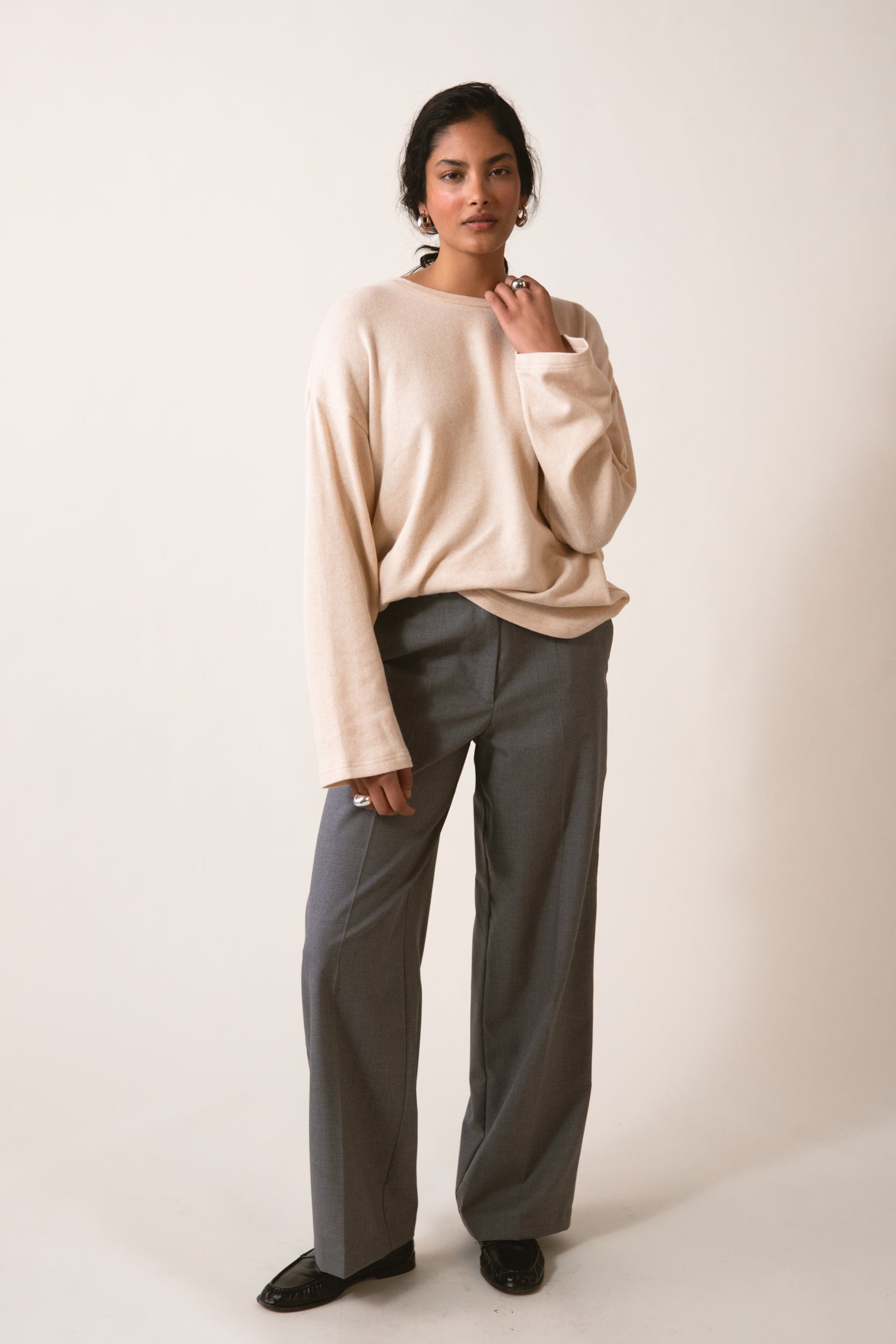 Szerokie spodnie z obniżonym stanem to model, który łączy klasykę ze swobodą. BETTER PANTS zaprojektowano tak, aby swobodnie układały się na biodrach, podkreślając nowoczesny charakter stylizacji. Uszyte z czystej wełny dziewiczej, świetnie trzymają formę, a zaprasowana nogawka z zaszewkami nadaje im charakterystyczny, dopracowany wygląd. Najlepiej prezentują się z TAN topem, który podkreśla ich obniżoną linię i nadaje całości właściwych proporcji.