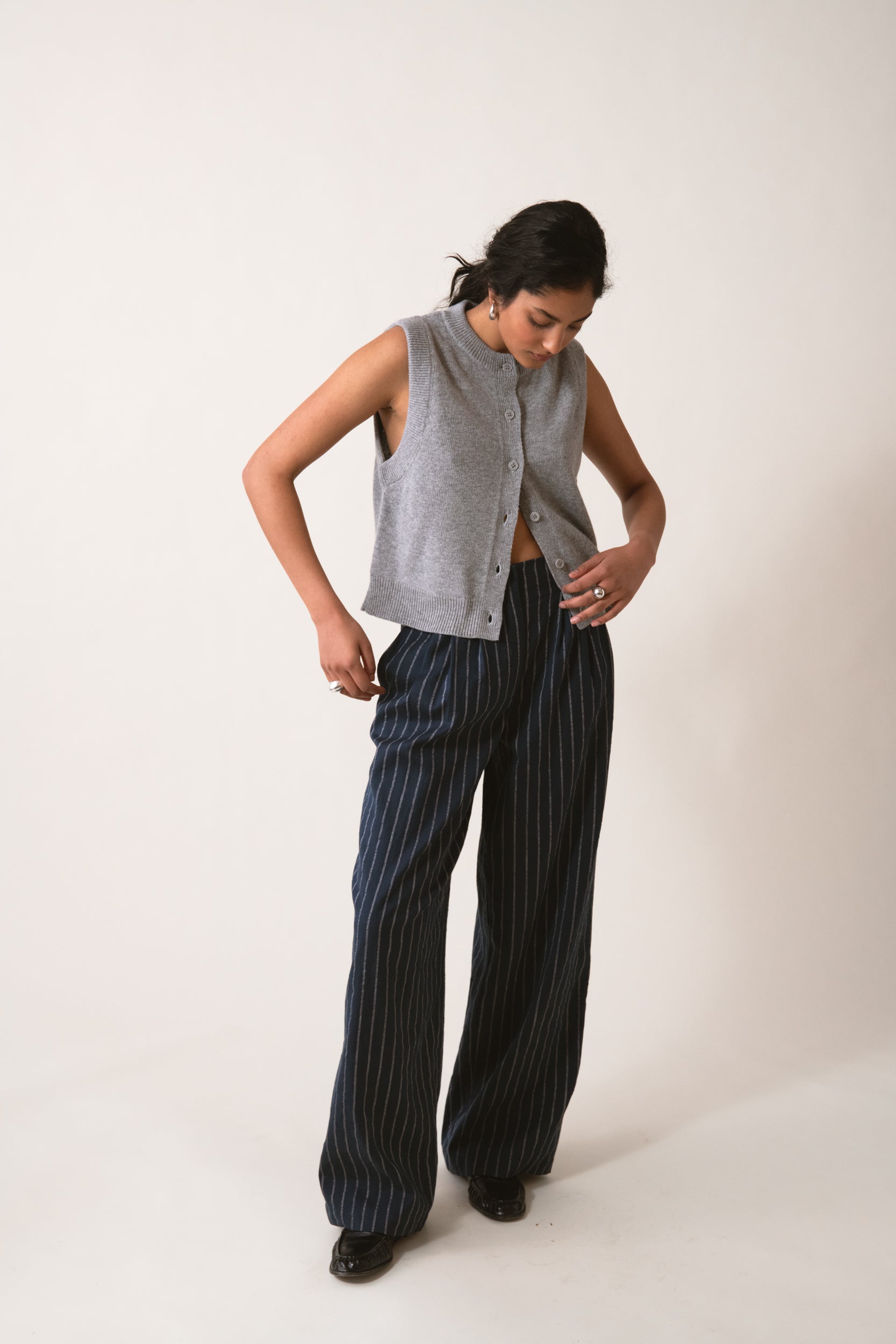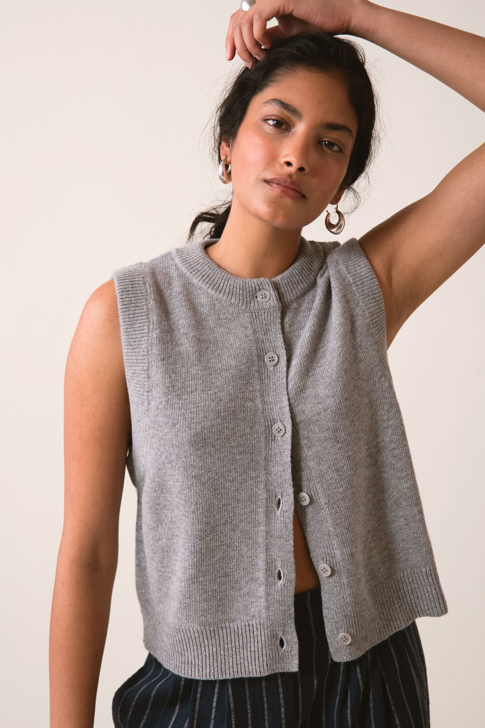 JEN to kamizelka o wielu możliwościach, stworzona z myślą o zabawie ze strukturą i warstwami. Jej krótki fason z wyrazistym, głębokim wycięciem bocznym i mocno obniżoną linią pachy, nadaje sylwetce zmysłowej lekkości. Wykonana z mieszanki merino i kaszmiru, jest miękka i przyjemna w dotyku. Guziki dobrano kolorystycznie tak, by komponowały się z szarym melanżem. To ponadczasowa baza, którą łatwo wystylizujesz na co dzień.Noś ją solo, by wyeksponować linię ramion, lub narzuć na koszulę TANGO tworząc niewymuszony zestaw z jeansami GIULIAN.