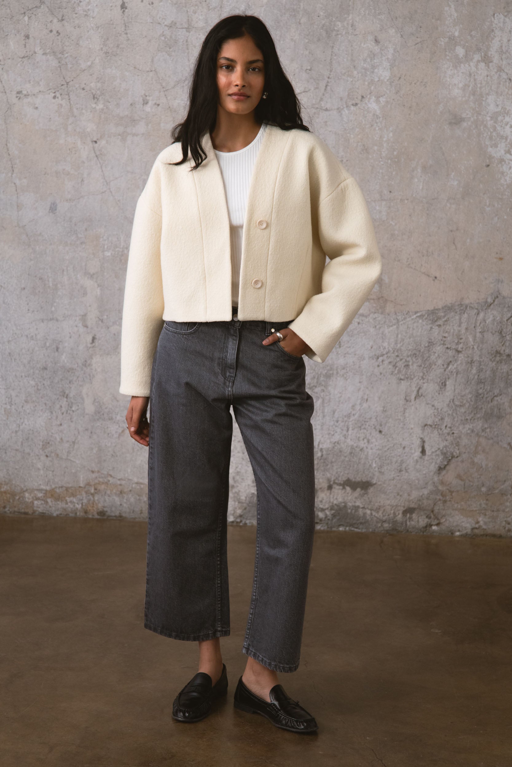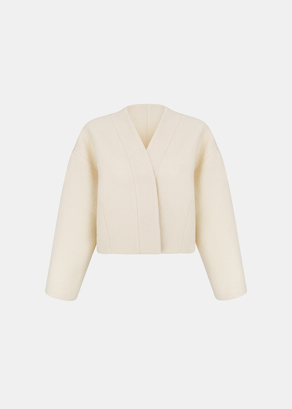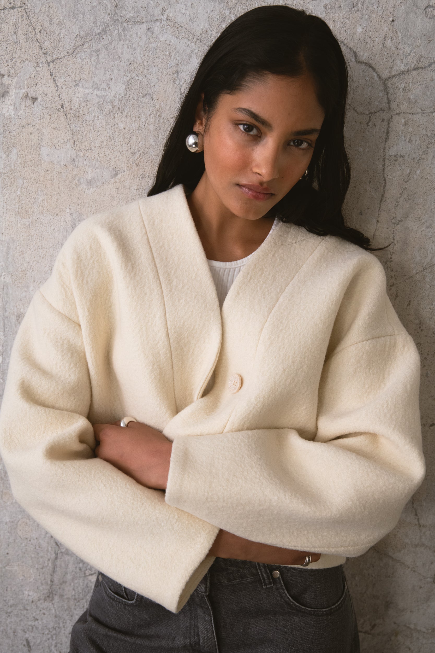 CAUGHT to marynarka o minimalistycznej formie, uszyta z czystej wełny o charakterystycznej, wypukłej strukturze. Brak kołnierza oraz głęboki dekolt w kształcie litery V nadają projektowi lekkości, a zapięcie na guziki ukryte pod dyskretną listwą pozwala zachować smukły efekt. Wnętrze wykończone wiskozową podszewką, która zapewnia swobodę noszenia. To model, który łączy konkretną strukturę materiału z nowoczesnym, luźnym krojem.