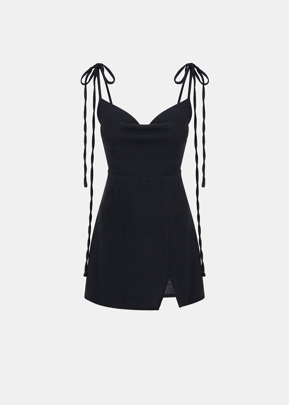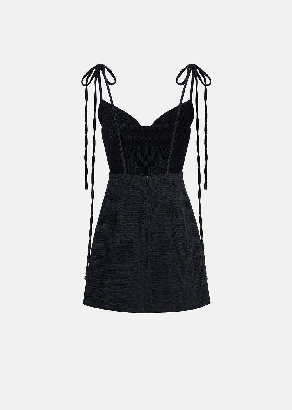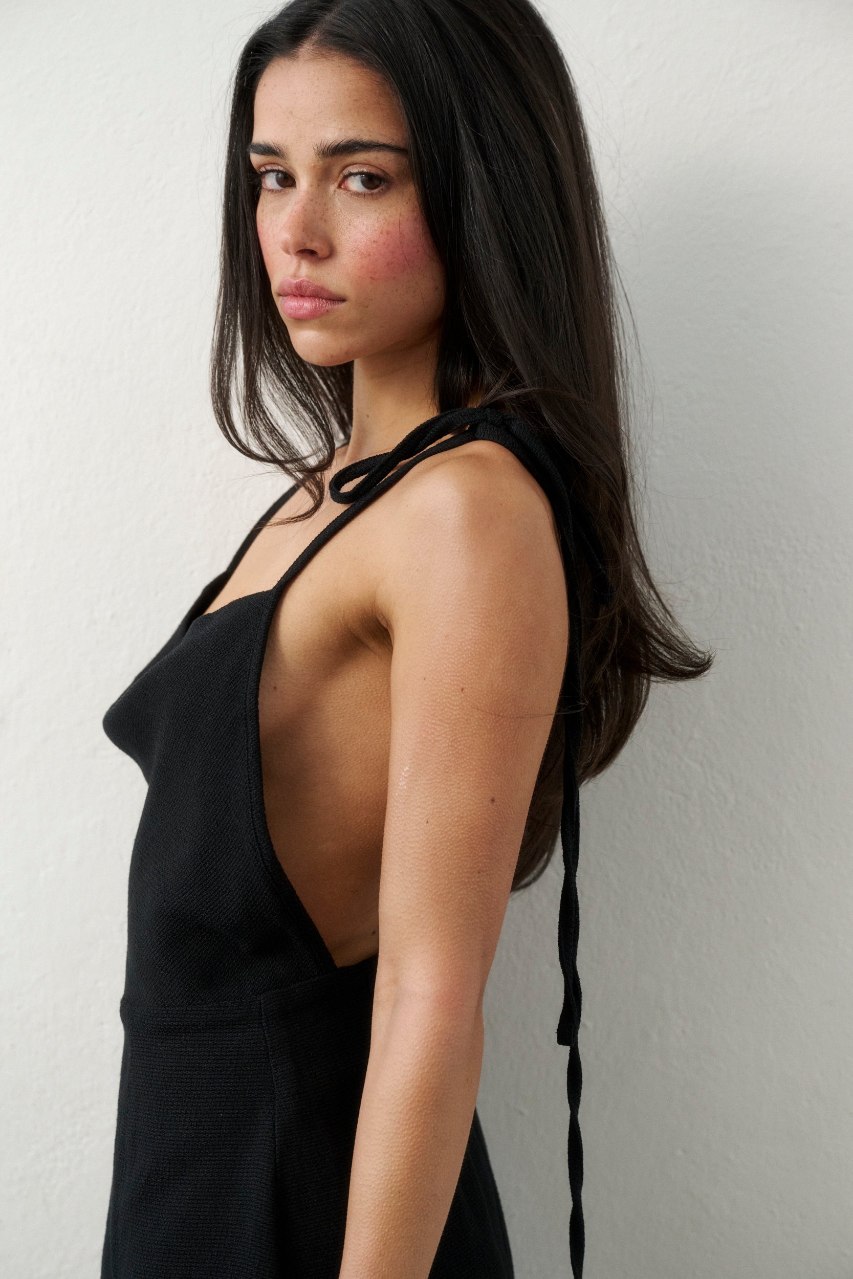 Sukienka mini w głębokim, matowym odcieniu czerni. Model z lejącym dekoltem, którego góra została krojona ze skosu z podwójnej warstwy materiału, co zapewnia idealne ułożenie i miękkość formy. Cienkie troczki wiązane na ramionach pozwalają na swobodną regulację wysokości dekoltu. Prosty fason dolnej części sukienki domyka minimalistyczną całość, a dyskretny zamek z tyłu gwarantuje wygodę. Mescal to baza dla wyrazistych zestawień. Aby stworzyć nowoczesny, miejski look, narzuć na nią naszą kurtkę YUKON.