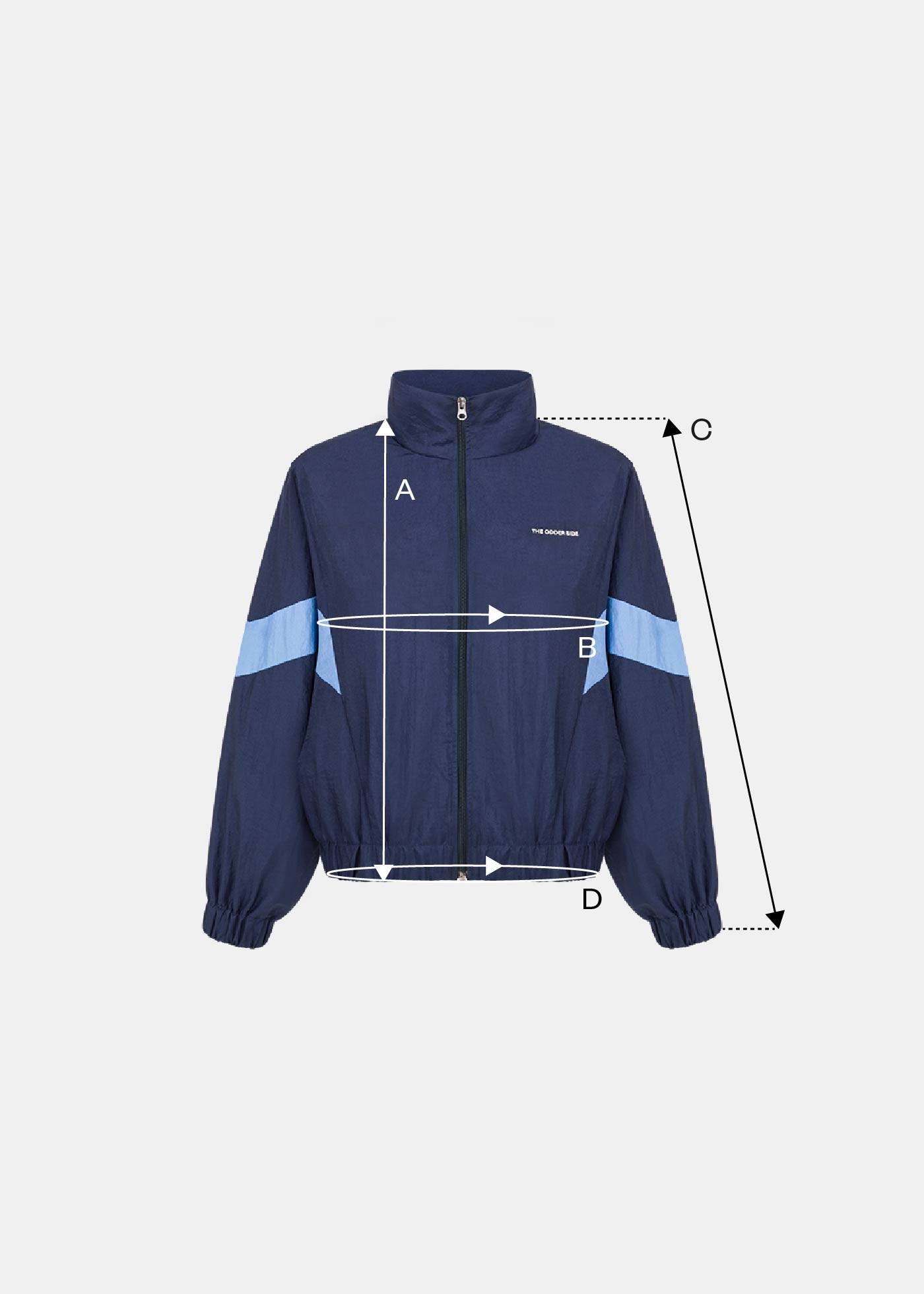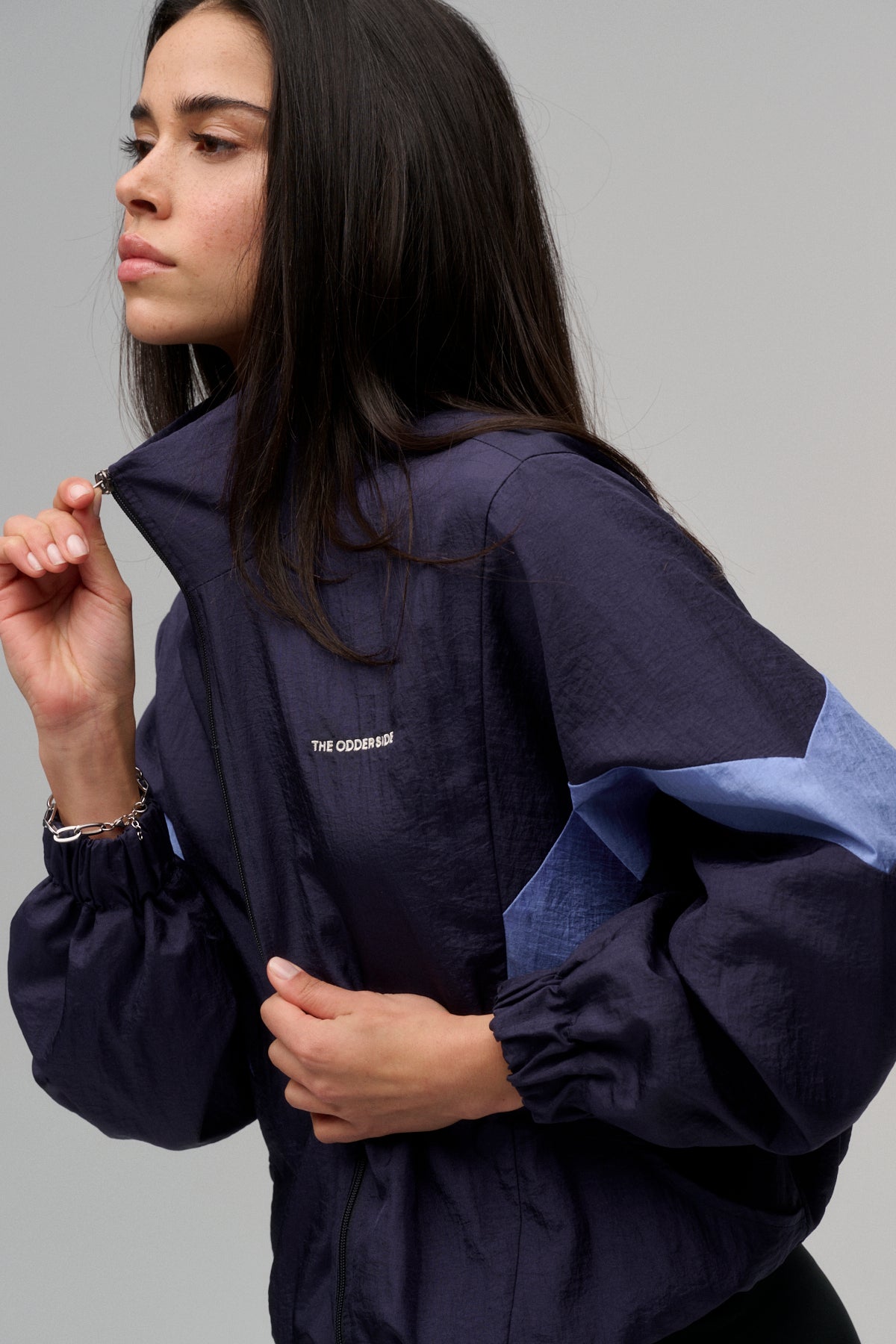 Krótka kurtka typu wiatrówka o swobodnym, pudełkowym kroju, wykonana z lekkiego ortalionu w kolorze głębokiego granatu. Projekt nawiązuje do klasycznej odzieży sportowej retro, łącząc funkcjonalność z nowoczesną, miejską formą. Kurtka charakteryzuje się dynamicznymi, geometrycznymi wstawkami z błękitnego materiału na rękawach oraz elastycznymi ściągaczami na dole i przy mankietach. Posiada wysoką stójkę i zamek błyskawiczny. Projekt domyka minimalistyczny akcent w postaci haftu The Odder Side na lewej piersi. To idealna warstwa do narzucenia po treningu – narzucona na nasz DUNK SET (top i szorty), domyka sportową bazę.