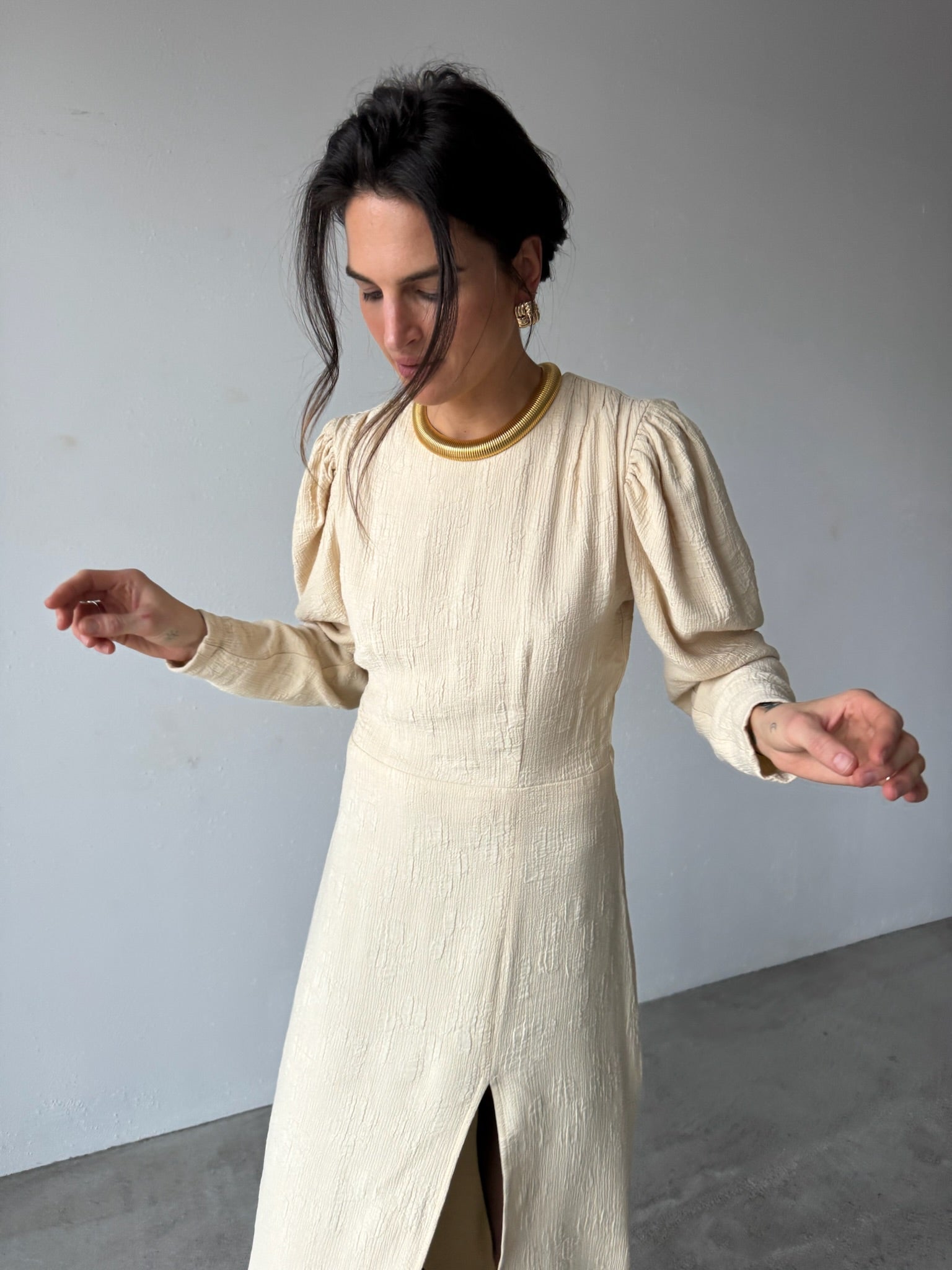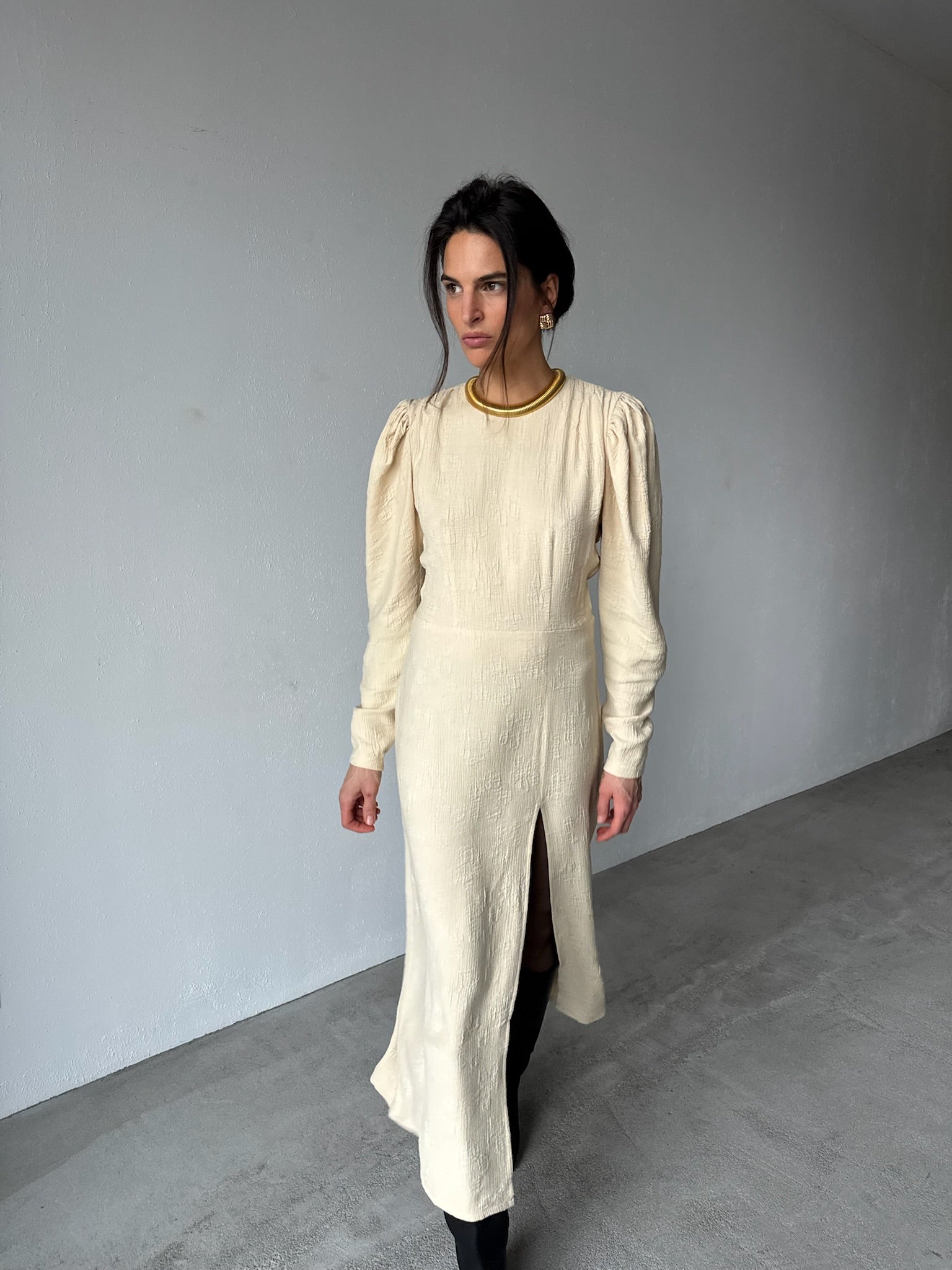 "Klasyczna elegancja", "subtelna kobiecość", "wysmakowany styl"- to jedne z wielu okresleń opisujących naszą nową sukienkę VELVET o ewidentnie retro zabarwieniu. Ma długość maxi, swobodny krój, długie rąkawy z bufkami oraz rozporek na lewym udzie, który nadaje jej lekkości, wysmukla i pięknie eksponuje nogę. Materiał, z którego jest uszyta dodatkowo podkreśla jej vintage look poprzez strukturalną powierzchnię i kolor ecru. Jest połączeniem wiskozy i poliamidu z recyklingu. Sukienka jest delikatnie taliowana- by wzmocnić ten efekt i bardziej wyeksponować talię świetnie do tego posłużą nasze nowe paski CINTO. Na chłodniejsze wieczory załóż do niej wełniany kardigan PAU w tym samym kolorze lub brązową kurtkę THARA jeśli chcesz przełamać elegancki wydźwięk sukienki.