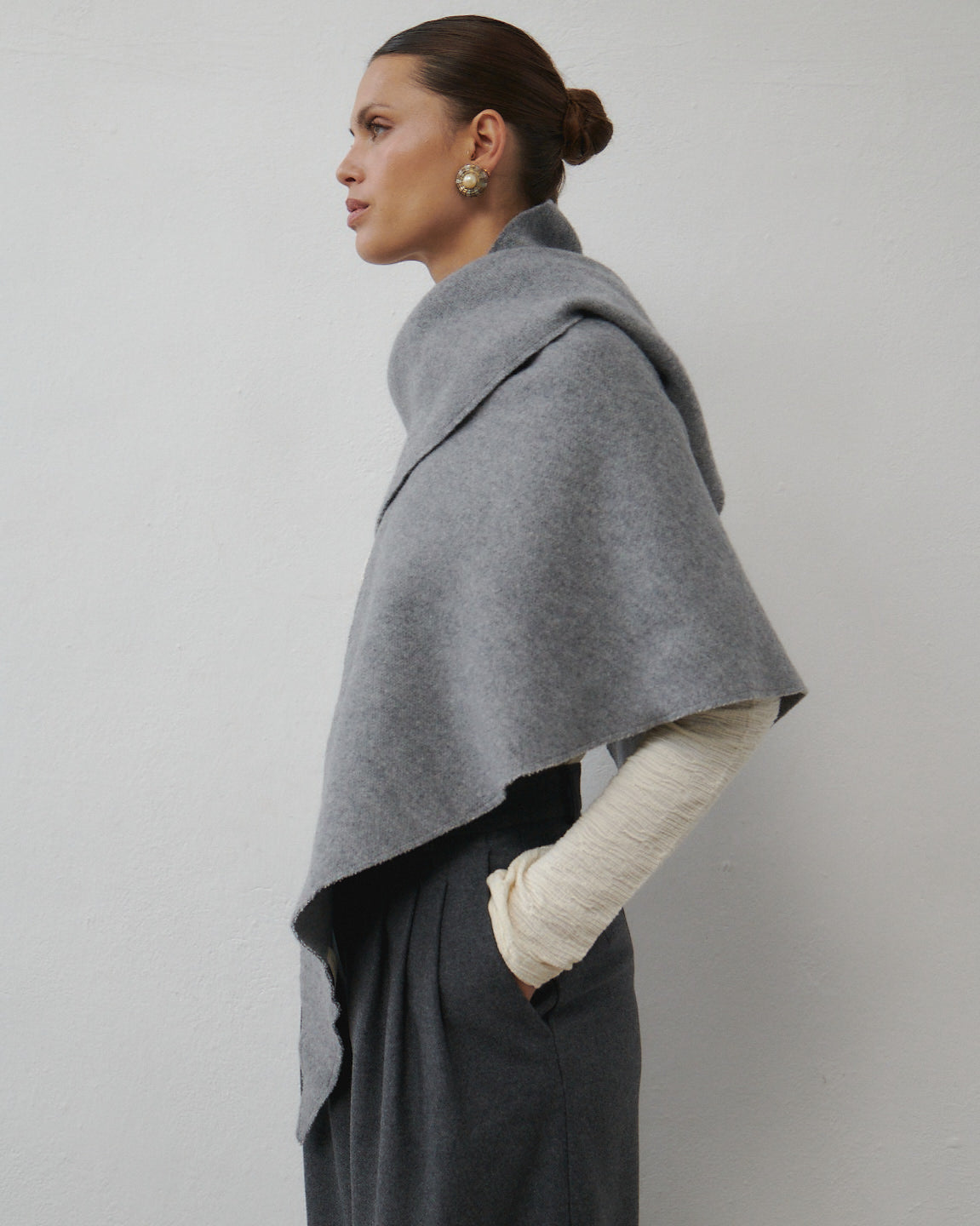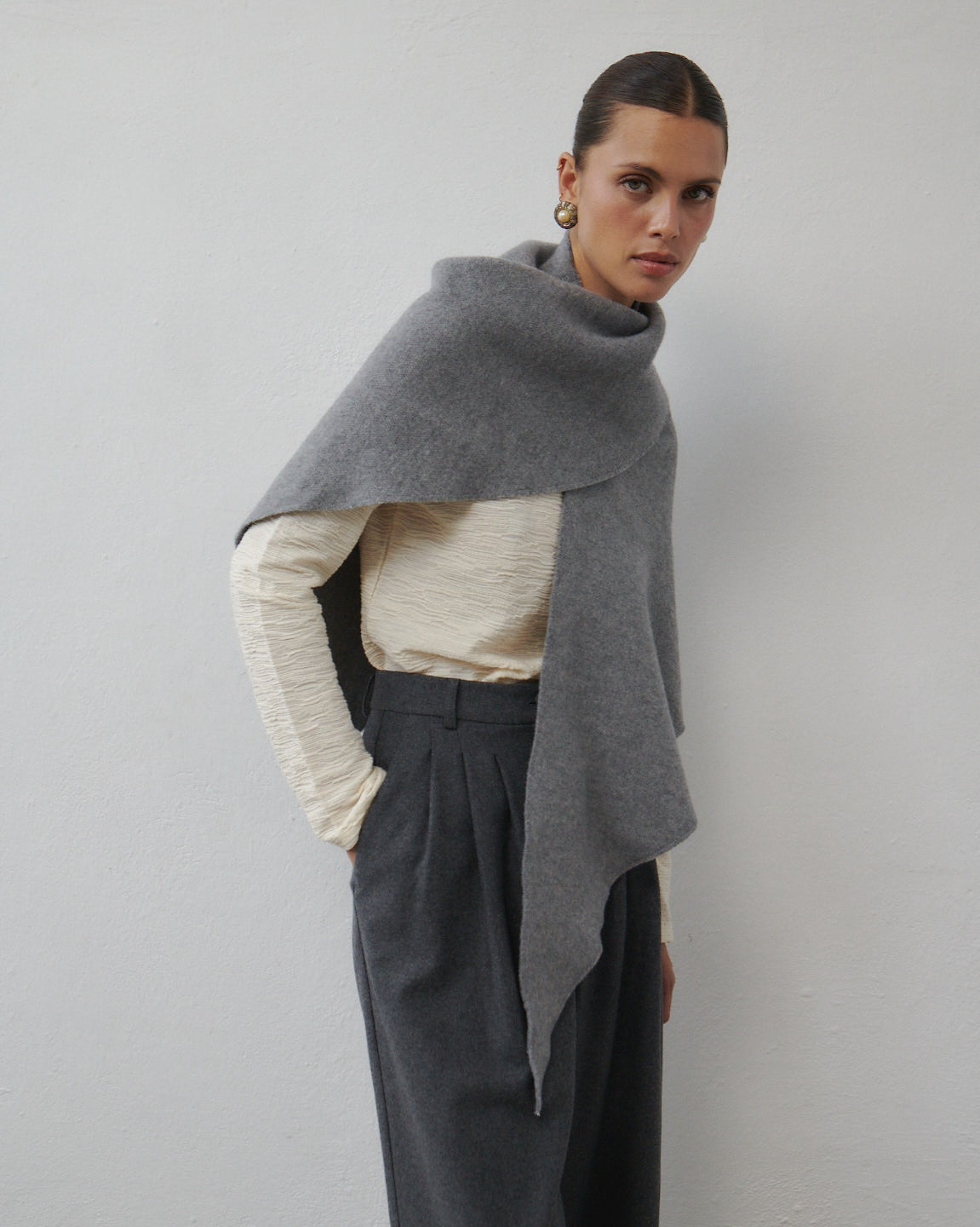 Trójkątna chusta w ponadczasowym kolorze szarego melanżu to nowa propozycja w naszym asortymencie akcesoryjnym. Nazywa się STILL i jest spore ryzyko, że nie oderwiesz się od niej przez cały jesienno-zimowy sezon. Jest duża, ma gładką powierzchnię, w większości naturalny skład i zero ograniczeń stylizacyjnych. Możliwości noszenia jej jest bardzo dużo. Możesz narzucić na ramiona, zawinąć wokół szyi, założyć na głowę, ułożyć w formę symetryczną lub asymetryczną, wiązać z przodu lub z tyłu.... Sky is the limit! Ty decydujesz!