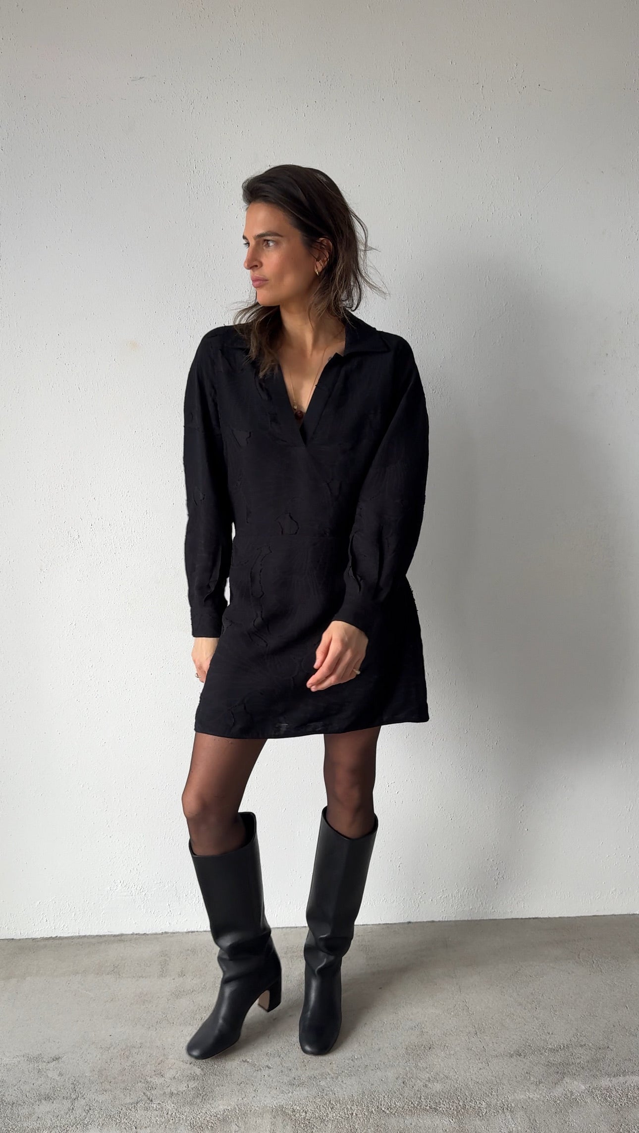 Sukienka z pięknej, tłoczonej wiskozy z dodatkiem nylonu, którą z powodzeniem założysz na co dzień do pracy, a wieczorem wyskoczysz na spotkanie ze znajomymi. Jest krótka, prosta, ma długi, reglanowy rękaw zakończony mankietem oraz charakterystyczny dekolt z kołnierzem i plisami typu polo. Tkanina tłoczona w kwiatowy wzór posiada subtelne przezroczystości dlatego dbając o Twój komfort część spódnicowa została wyposażona w podszewkę. Noś ją solo lub z paskiem CINTO jeśli chcesz bardziej podkreślić talię, a w chłodne wieczory zarzuć kurtkę DINA, PAU lub ESPRESSO. Świetnie będzie pasować do mokasynów, balerinek, botków jak również do kozaków.