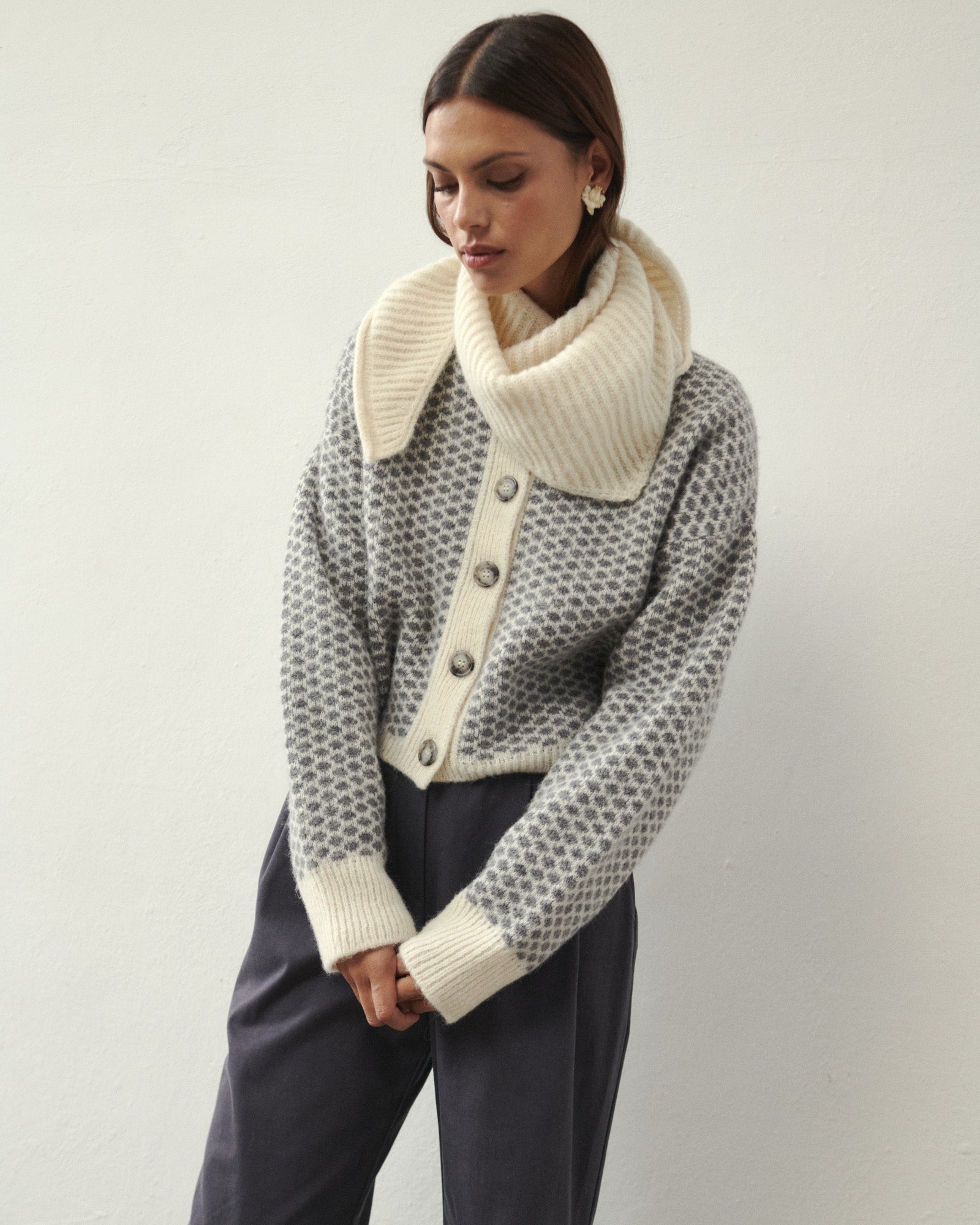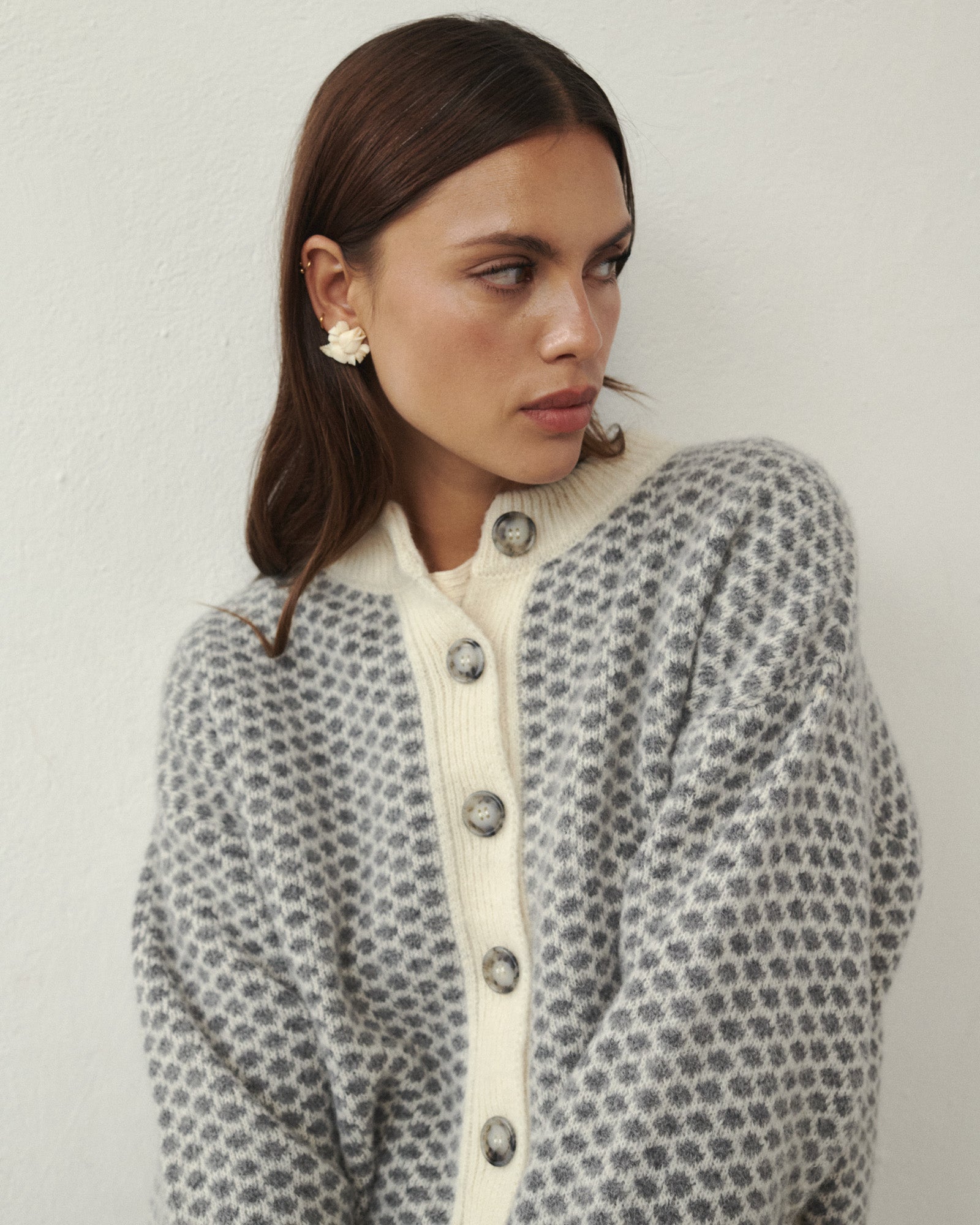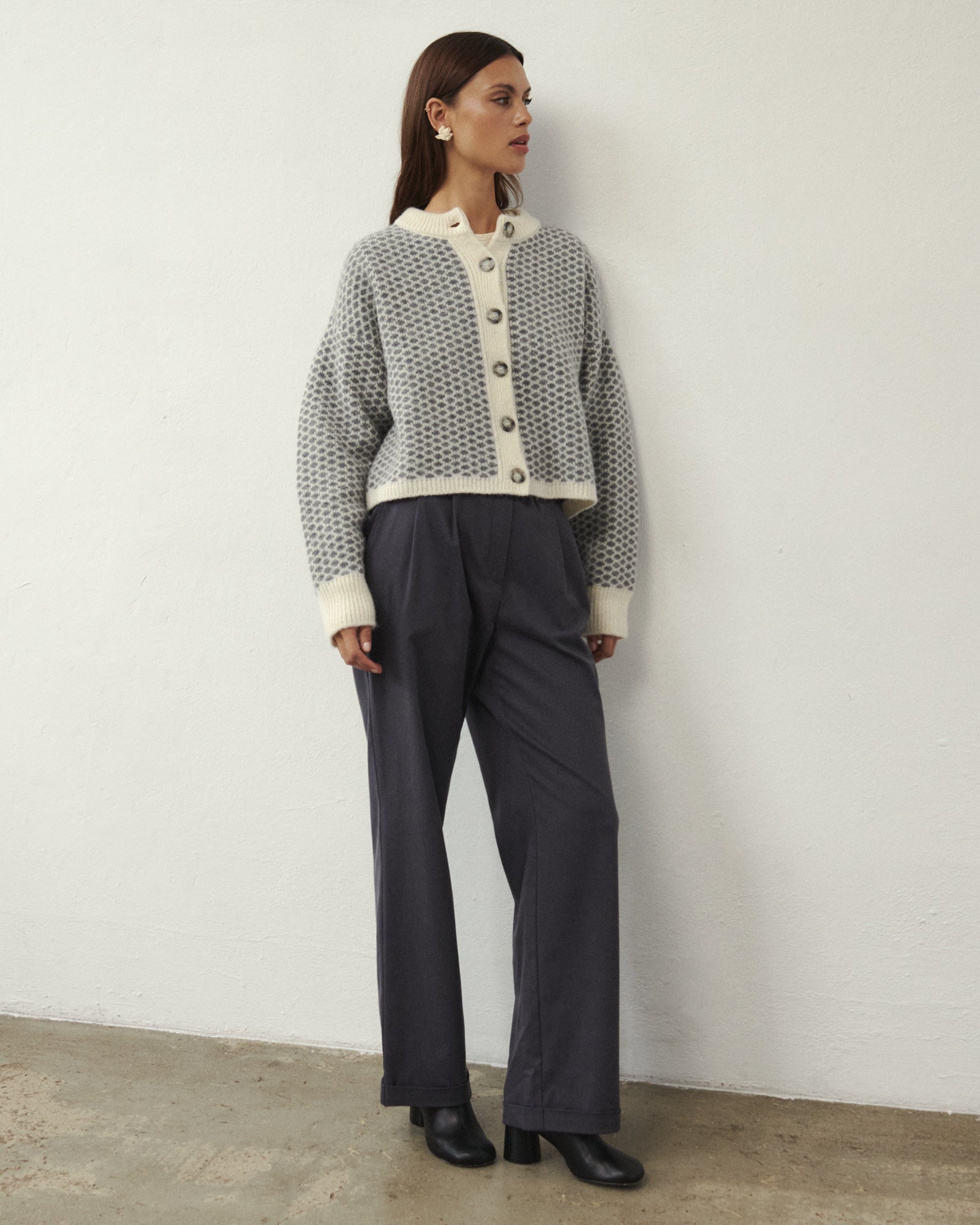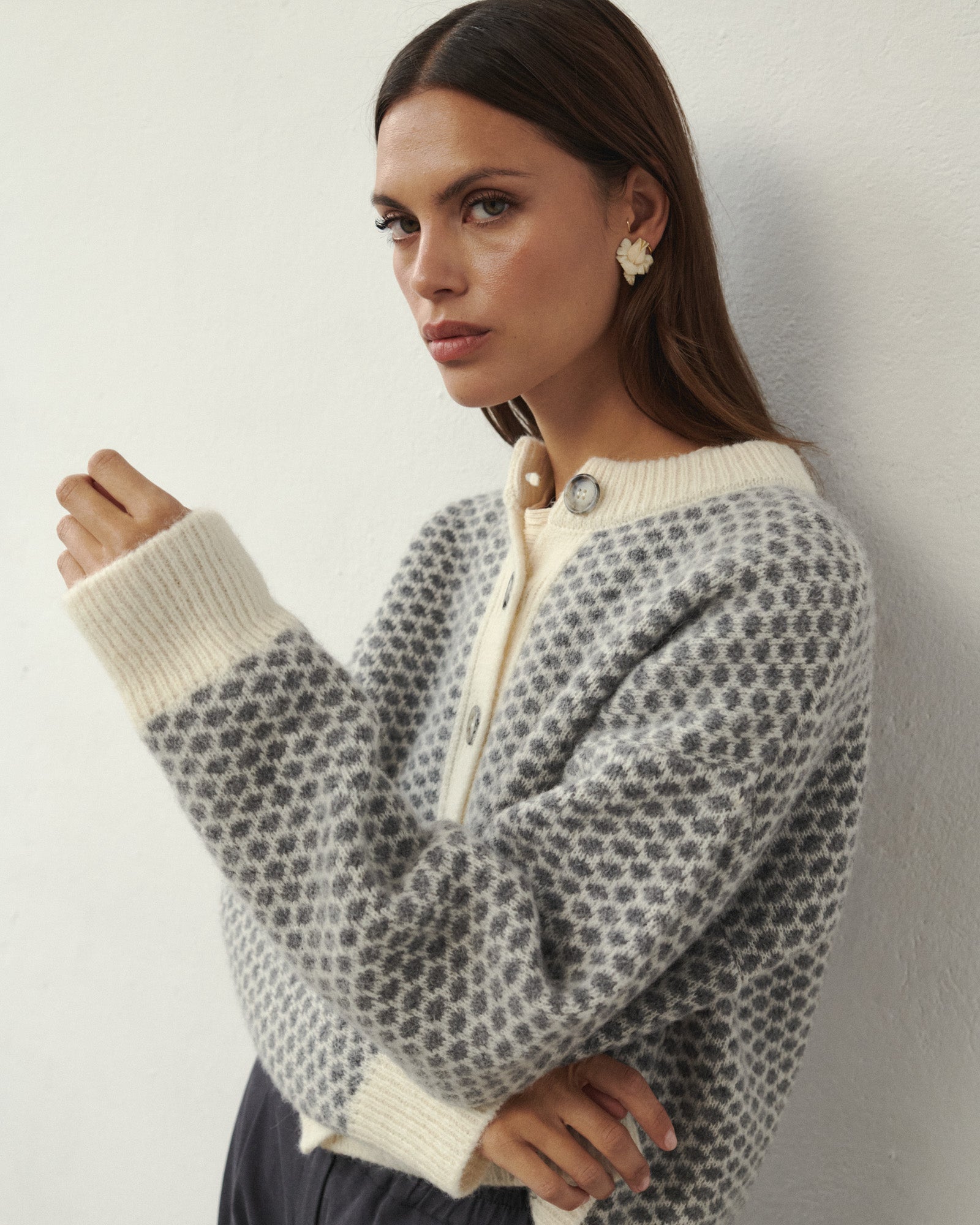 TASTE to stylowy kardigan zapinany na guziki. Łączy w sobie klasyczny styl z nowoczesnym wzornictwem. Ma luźny, pudełkowy fason, obniżoną linię ramion oraz wykończenie o splocie ściągaczowym. Wykonany został z 2 kolorów przędzy będącej połączeniem baby alpaki, wełny dziewiczej i poliamidu. Ten skład zapewni Ci komfort termiczny i przyjemność noszenia przez cały dzień. TASTE to nieodzowny element Twojej garderoby jako baza do wielu stylizacji- tych na co dzień i bardziej eleganckich. Noś go do spodni ELAN, spódniczki NAN lub na wierzch do sukienki LENS.