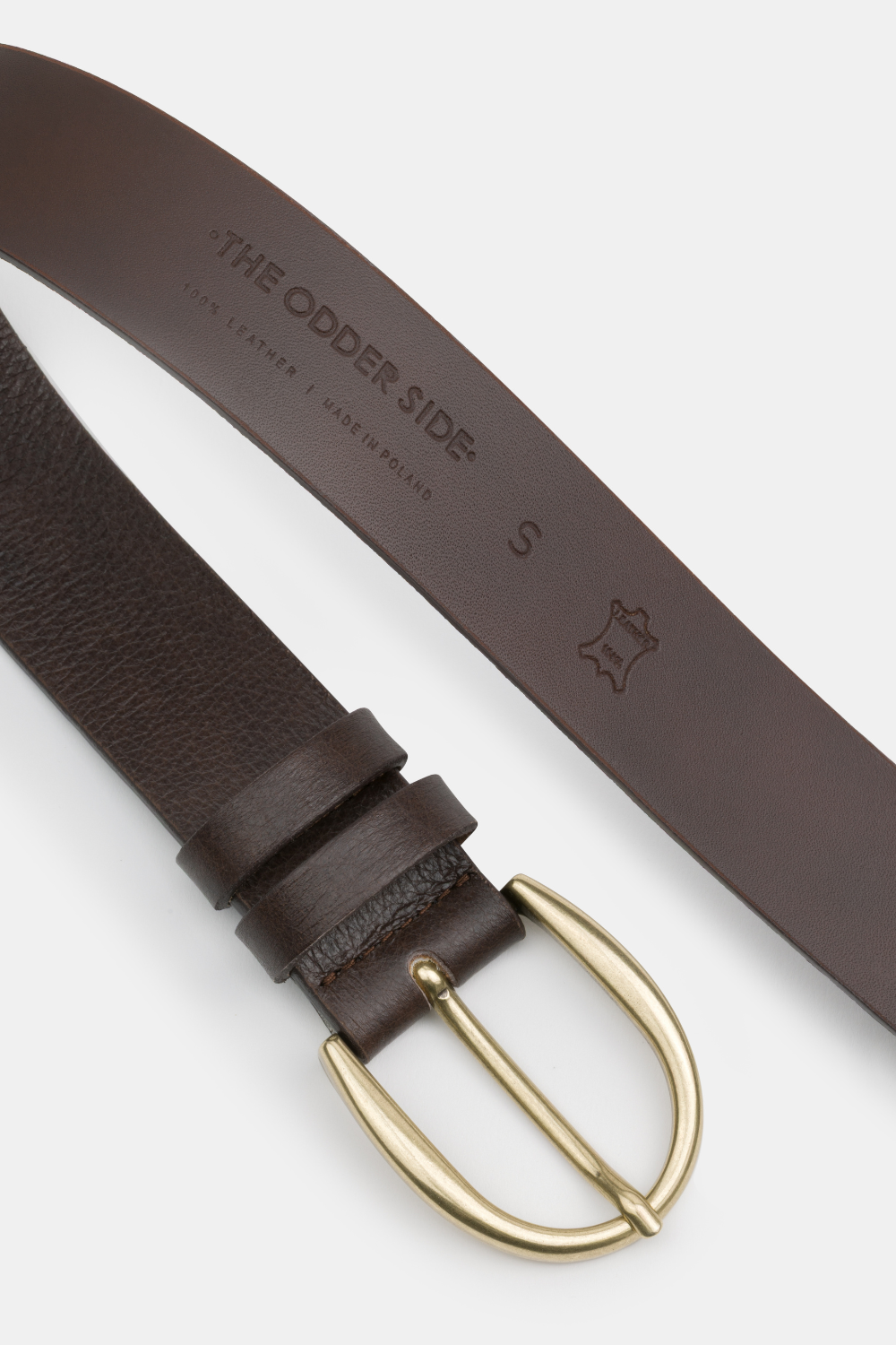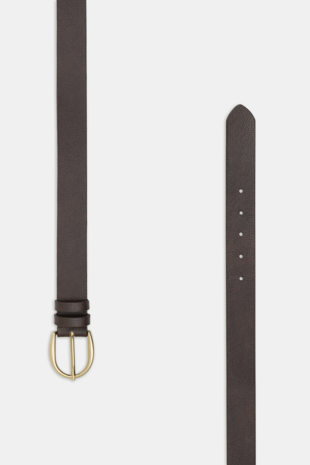LINO to nowy w naszej ofercie akcesoryjnej model skórzanego paska. Ma klasyczny charakter z półokrągłą klamrą i praktyczną, skórzaną szlufką. Skóra w ciemnym kolorze brązu kontrastuje ze złotą, postarzaną klamrą. Szerokość paska to 34 mm. Noś do spodni ze szlufkami jak NOMA lub jeansami SEVENTEEN a także do sukienek, w których chcesz podkreślić talię, np VELVET.