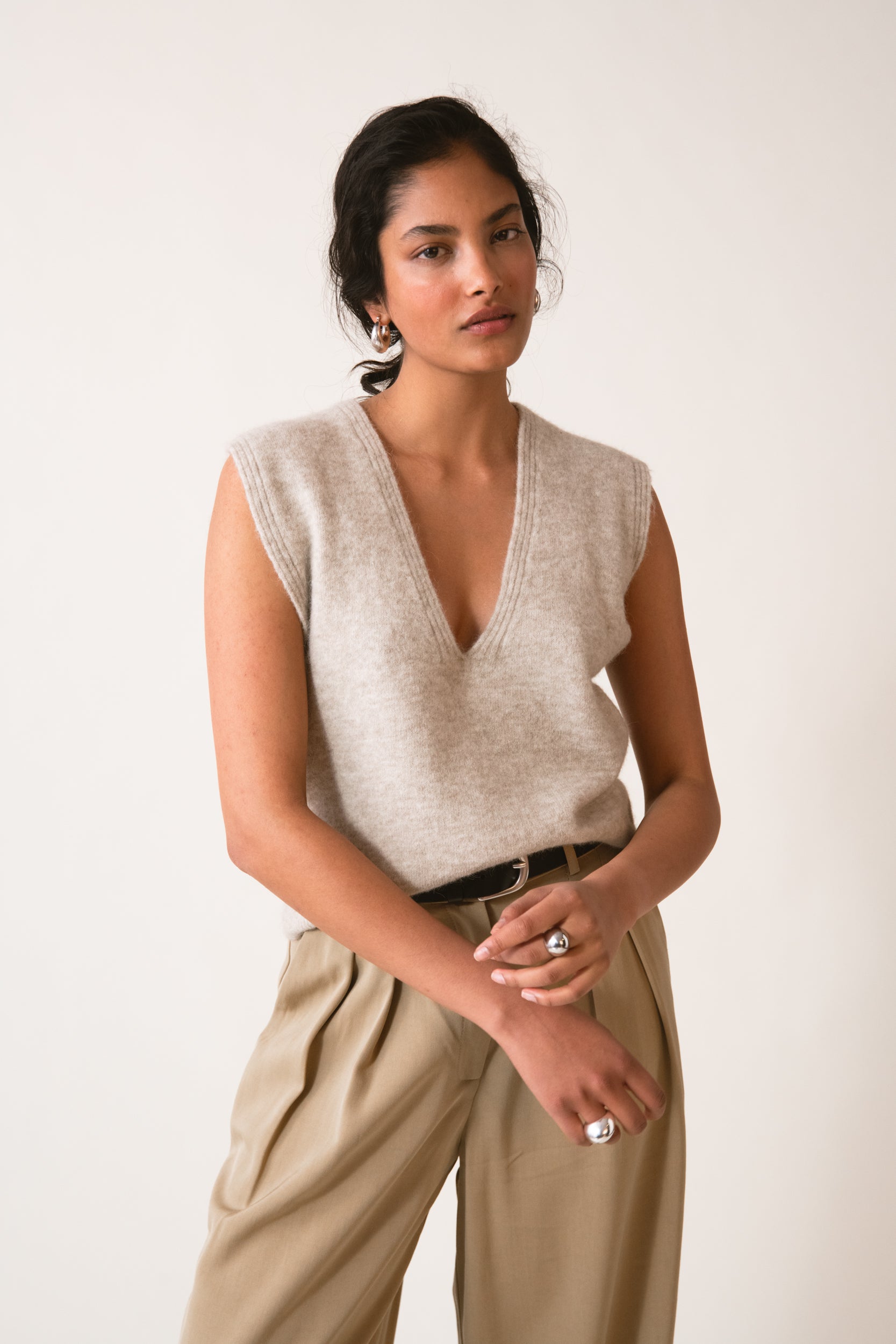 Kamizelka PASCAL to esencja niewymuszonego szyku i dowód na to, że mniej znaczy więcej. Jej prosta forma z wydłużoną linią ramion i głębokim wycięciem w kształcie litery V pięknie eksponuje dekolt, równoważąc proporcje sylwetki. Wykonana z niezwykle miękkiej mieszanki baby alpaki i wełny - jest przyjemna dla skóry, dzięki czemu możesz ją nosić bez dodatkowej warstwy.To baza, która daje wiele możliwości: noś ją z jeansami WANDER lub z spodniami JIL w bardziej minimalistycznym wydaniu.